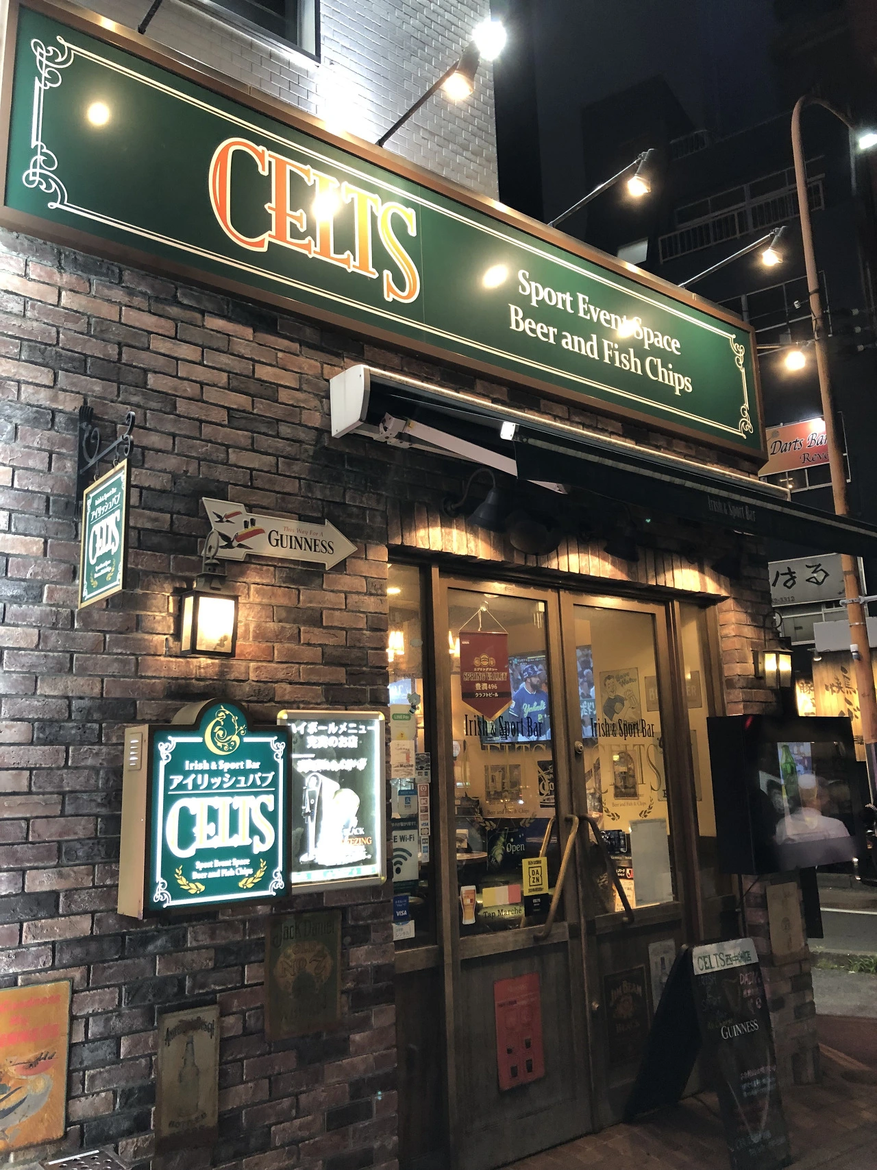 그날 저녁을 먹으러 가기로 결정해서, 다시 그곳으로 걸어가 보았다. 후쿠오카의 유명한 강변 포장마차 거리가 있는 곳에서 조금만 더 가면 있는 그 가게는, 사실 일본 가게 같은 느낌은 아니었다. 유럽에나 가면 있을 법한 간판과 벽돌 모양, 창문 디자인까지. 가게 간판에도 적혀 있다. 아이리쉬 펍 이라고.