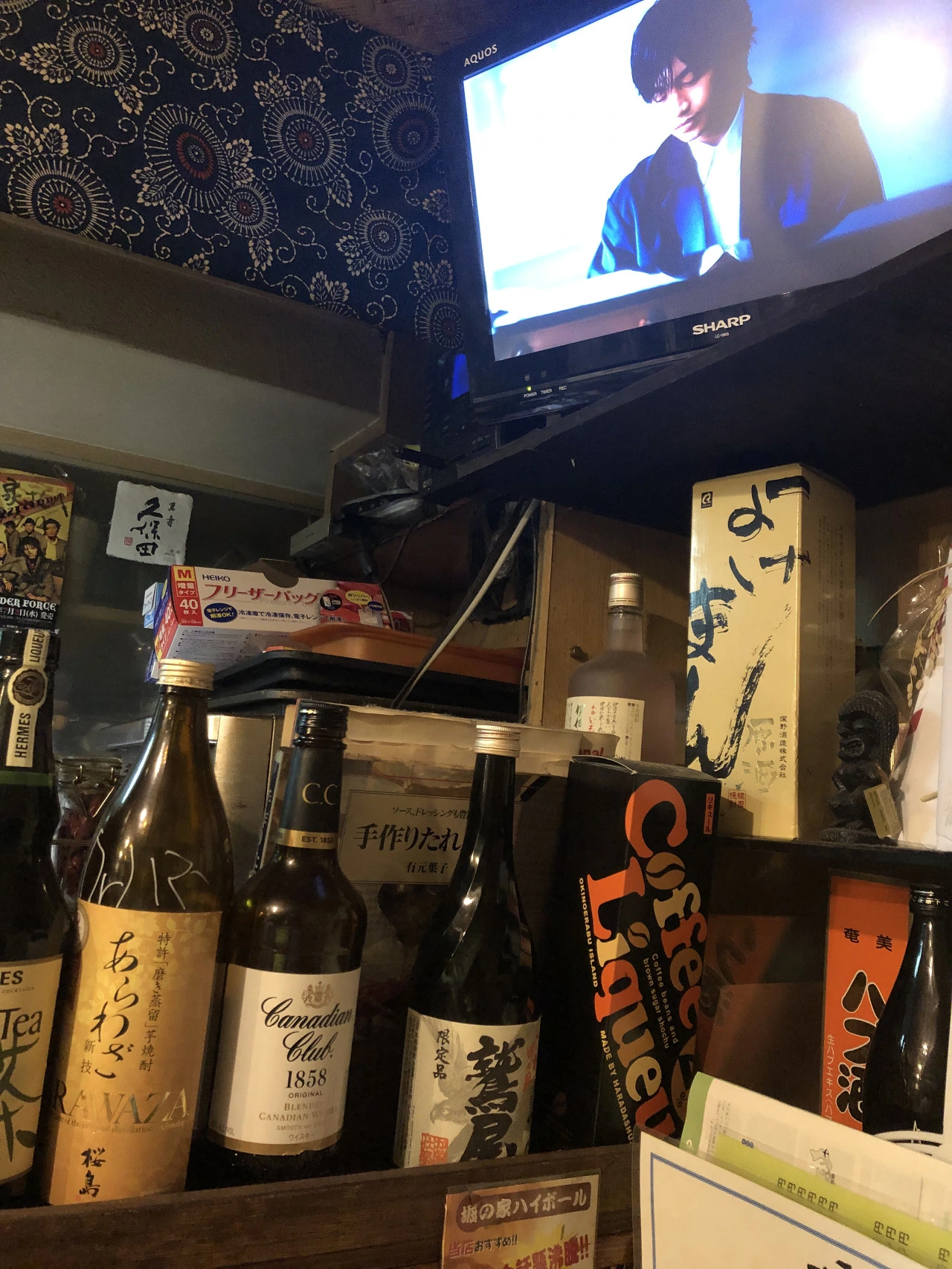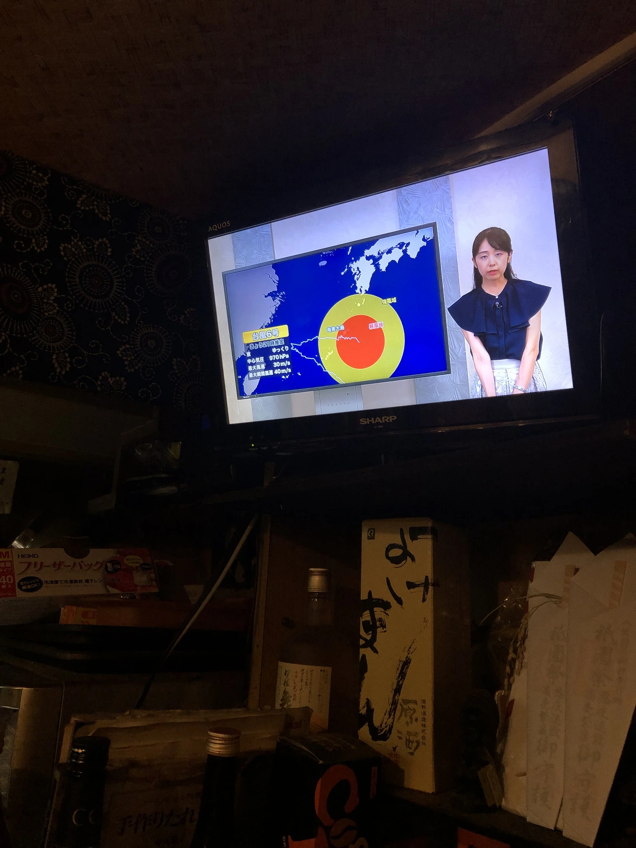 음식점은 넓지 않았지만 좁은 공간이 빈틈없이 꾸며져 있었다. 내가 좋아하는, 주방이 보이는 바 테이블 자리에 앉았다. 바로 앞쪽에는 술병이 있고, 오른쪽에는 티비가 있었다. 왼쪽에는 현지 사람인 듯한 사람 둘이 술을 마시고 있었다. 티비에서는 일기예보가 흘러나오는데, 남쪽의 태풍이 갑자기 서쪽으로 방향을 꺾어 가고시마 쪽으로 올라오는 모습이 나오고 있었다. 여행지로 시시각각 다가오는 태풍 일기예보를 본다니, 어쩔 수 없는 아쉬운 마음.