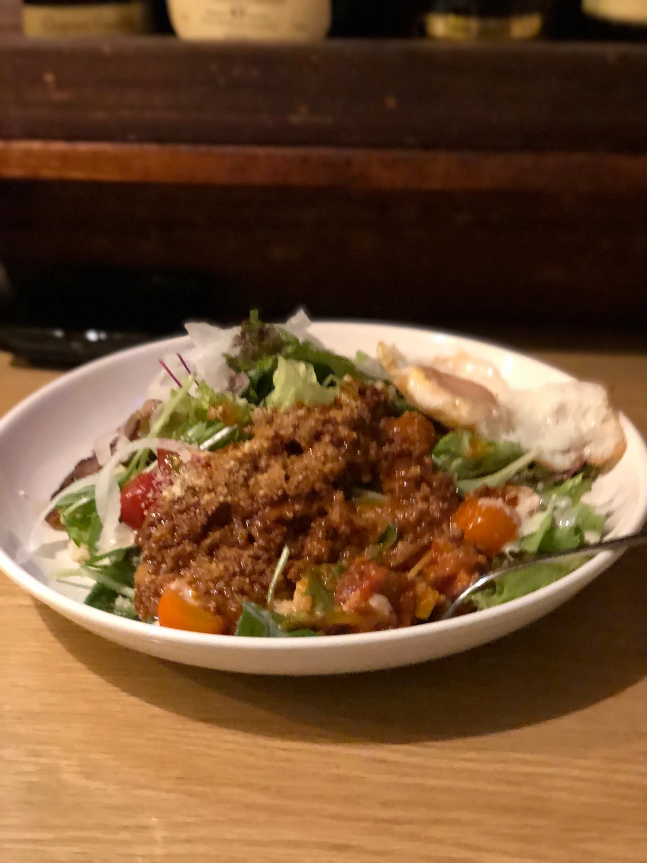 메뉴로 뭘 먹을까 하다가, 추천하는 음식을 만들어 달라고 했다. 하이볼 한 잔을 먹으면서 기다리니, 파스타 느낌이 나는 덮밥이 나왔다. 밥 위에 토마토 소스와 계란 후라이, 베이컨이 올라간 음식이었다. 이날 제대로 먹은 음식이 없어서, 따뜻하고 양 많은 한 끼를 먹으면서 이런저런 이야기를 했다. 가고시마에 어떻게 오게 되었는지, 일본에 다른 곳은 어디를 가 보았는지. 야쿠시마에 가 보고 싶었는데 못갔다, 가이몬 산도 가 보고 싶었는데 날씨가 좋지 않아 갈 수 없었다 이런 이야기를 했다.
