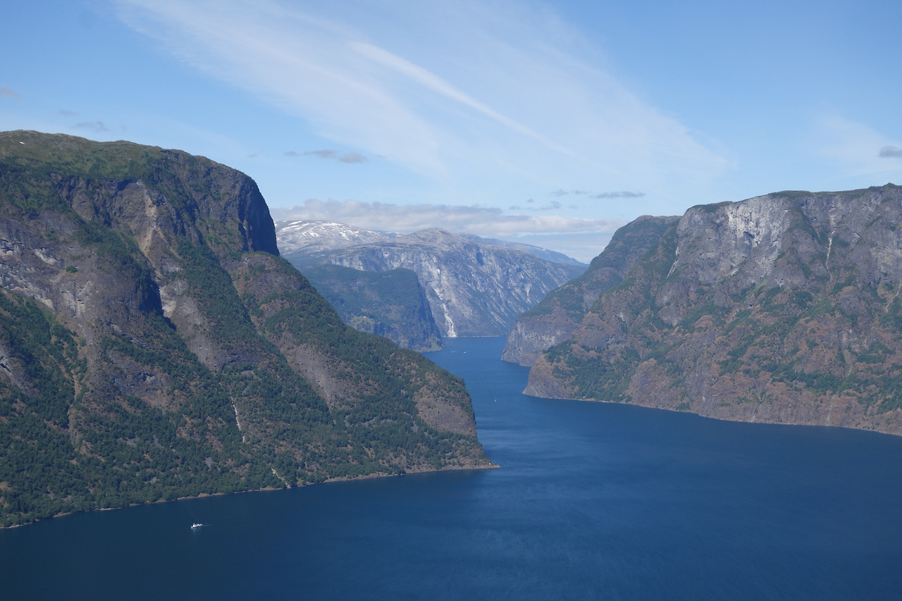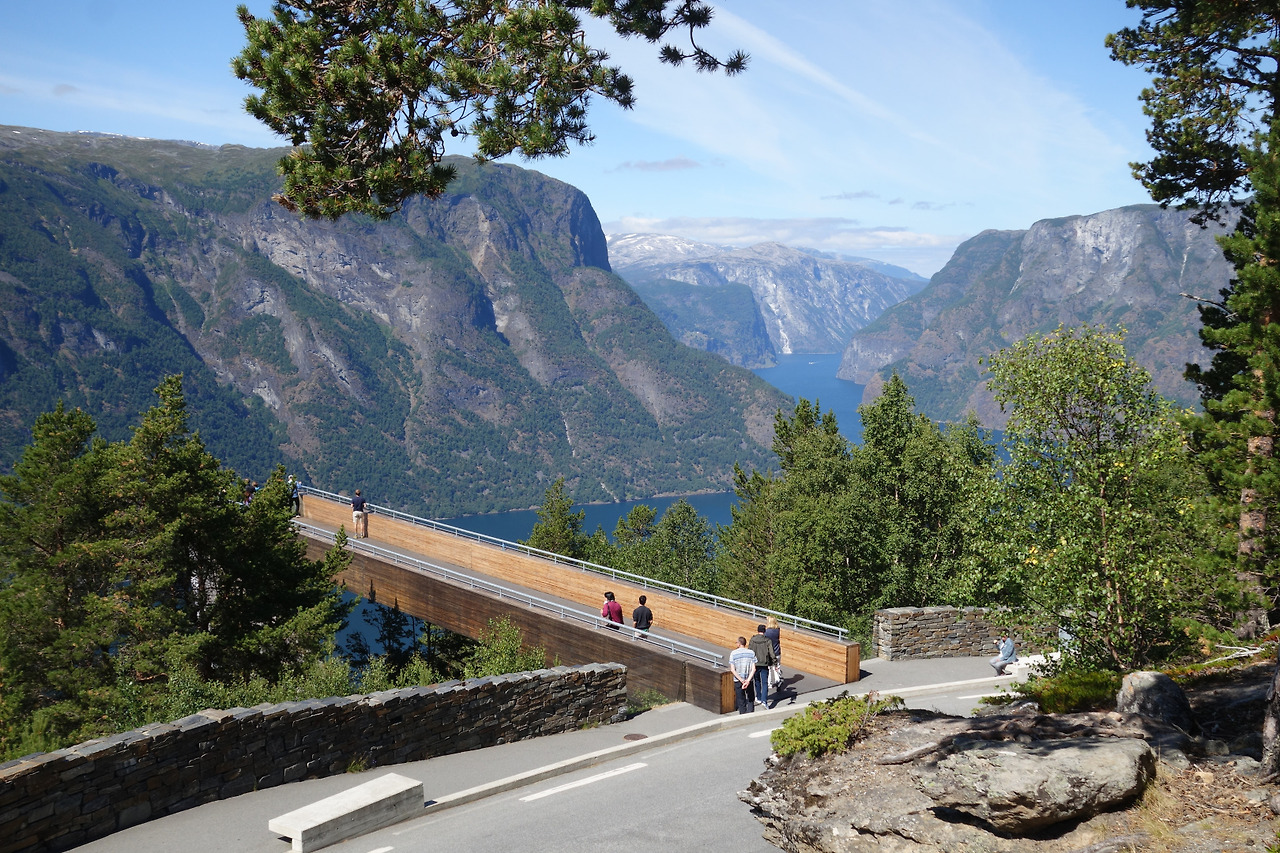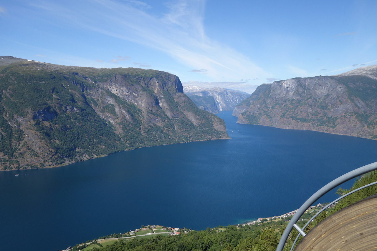 버스는 스테가스테인 전망대 근처의 주차장에 서서 사람들을 내려놓는다. 절벽에 마치 쭉 뻗은 미끄럼틀처럼 놓여 있는 이 특이한 구조물 끝에 가면 깊은 피오르드 계곡이 한눈에 들여다보인다. 저 멀리 작은 마을부터 시작해서 깎아지른 벼랑 위 아직도 녹지 않은 눈들까지. 계곡을 채운 짙은 남색 바닷물 위로 배가 오가는 모습도 선명히 볼 수 있다.
