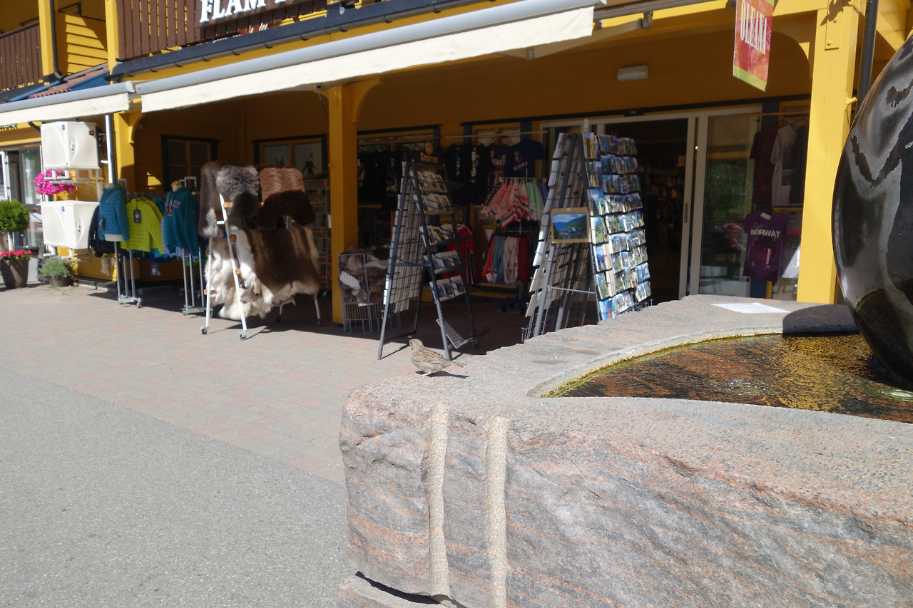 표를 끊은 뒤 시간이 조금 남아 관광안내소 근처를 돌아본다. 바로 옆쪽에 마치 항구 창고처럼 투박한 건물이 있다. 기념품 상점과 작은 조형물이 있는 분수대, 그리고 플롬에서 단 하나뿐인 카페가 있다. 직접 빵도 굽고 커피도 내려서 나중에 가 보기로 했다. 분수대 근처에서는 참새를 볼 수 있다. 새들은 사람이 가까이 가도 도망가지 않아서 아주 가까이 가서도 새를 구경할 수 있다. 새를 좋아하는 나에게는 너무나도 반가운 일이다.