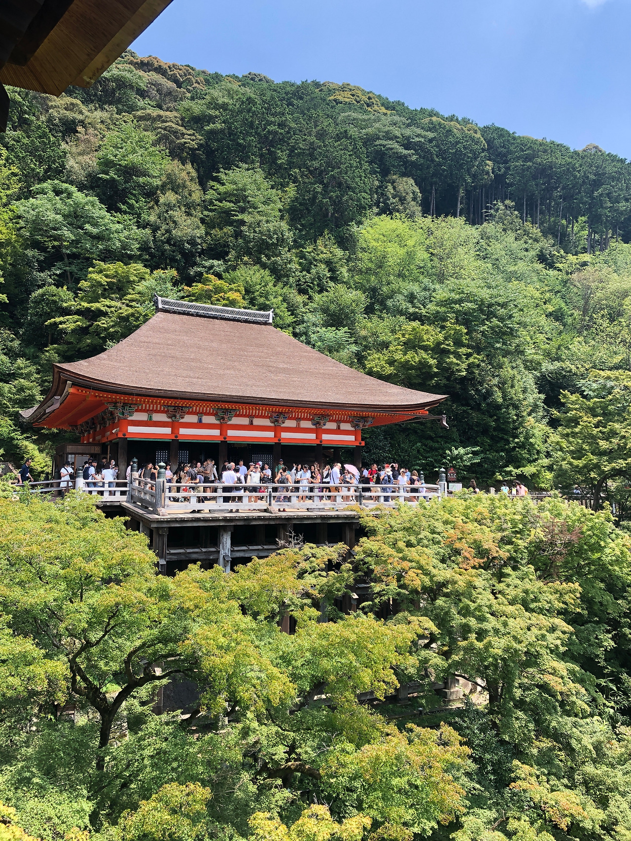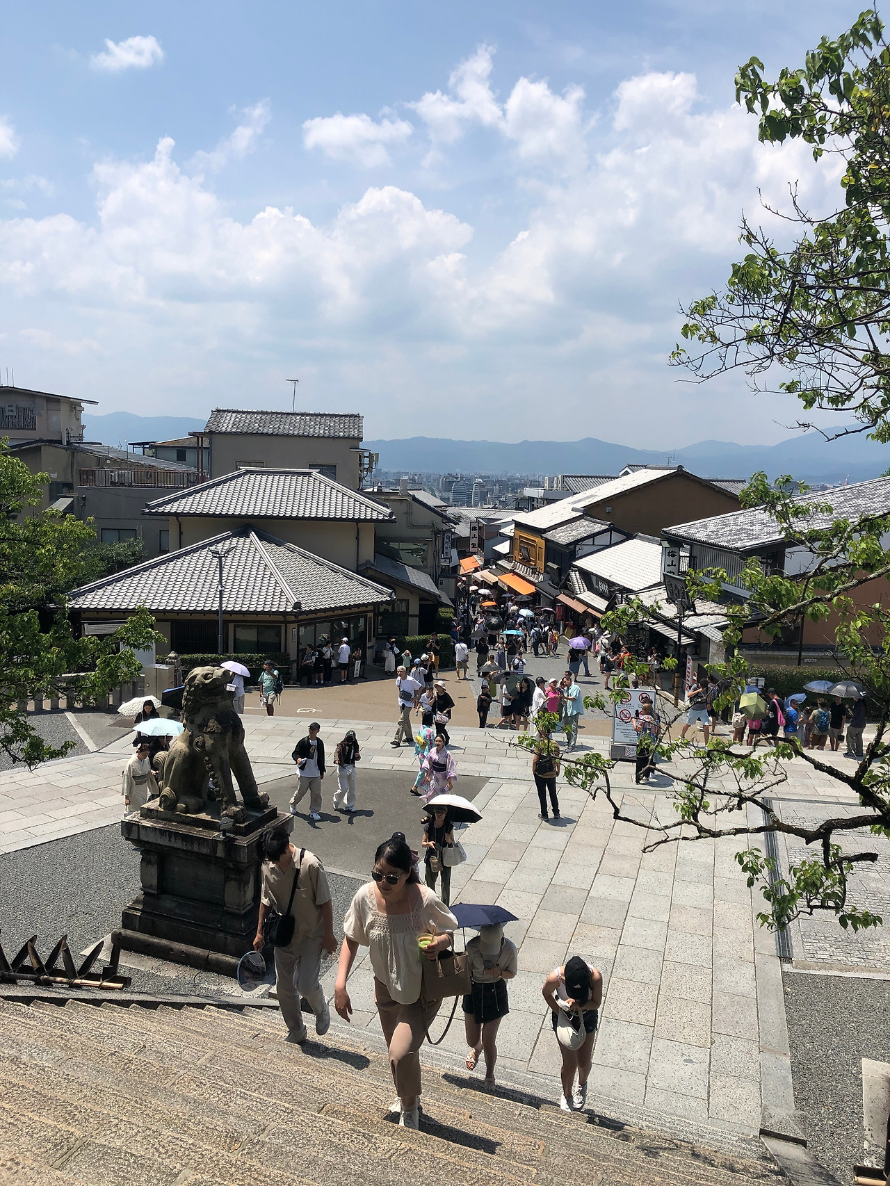 결국 청수사 아래쪽 상점가들이 보이는 정도까지 올라가고 나서, 더이상은 못 참았던 온 가족이 보이는 아무 카페에나 들어가서 음료를 마시면서 숨을 좀 돌렸다. 잠깐 쉬고 나서 사람들로 바글거리는 상점가를 지나 올라가니, 교토 시내가 내려다보이는 청수사가 있었다. 건물 아래쪽의 어두운 통로를 지나가는 체험도 해 보고, 유명한 건축물도 보면서 나도 옛날 고등학교 때 왔던 기억을 떠올리기도 했다. 힘겹게 올라왔지만 그래도 다들 만족스러워 하는 것이, 온 보람이 있는 것 같아 다행이었다. 그리고 내려가는 길 우리는 택시를 타고 다시 도심으로 돌아가기로 협의했다. 택시를 타고 나서야 알았다. 더운 교토 날씨에 도보이동을 오래 할 것이라면 무조건 택시를 타야 한다는 것을.