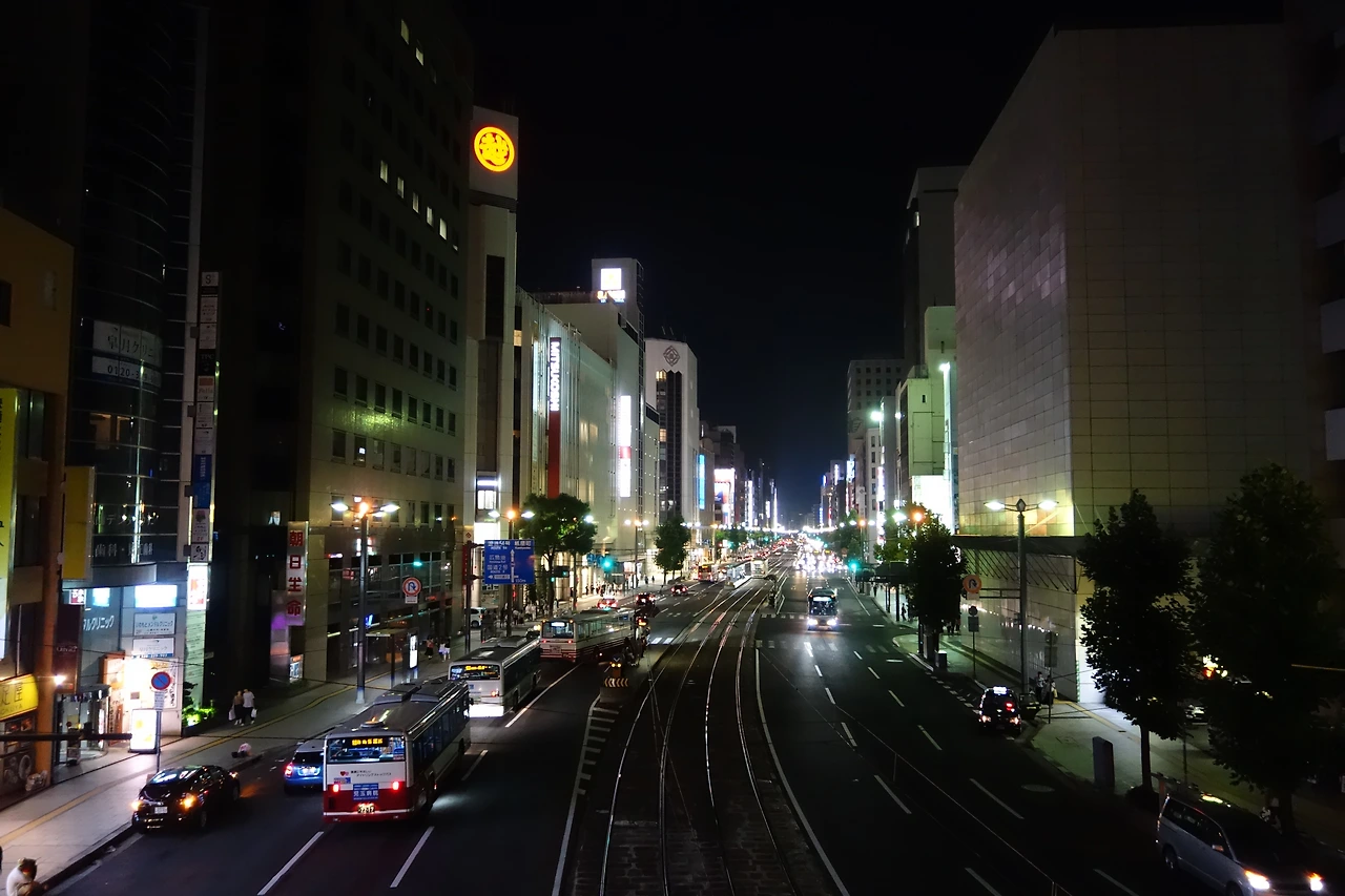 큰 길을 건너기 위해 육교를 올라가 보니 아래로 내려다 보이는 광경이 좋다. 히로시마 시내를 다니는 노면전차 노선이 가운데에 있고 그 옆으로 차들이 지나다닌다. 양 쪽의 큰 건물 사이로 가로등이 켜져 있고, 그 사이로 자동차의 불빛이 어지러이 엮인다. 불빛의 행렬은 오고 가고를 반복하며 저 멀리까지 이어진다.