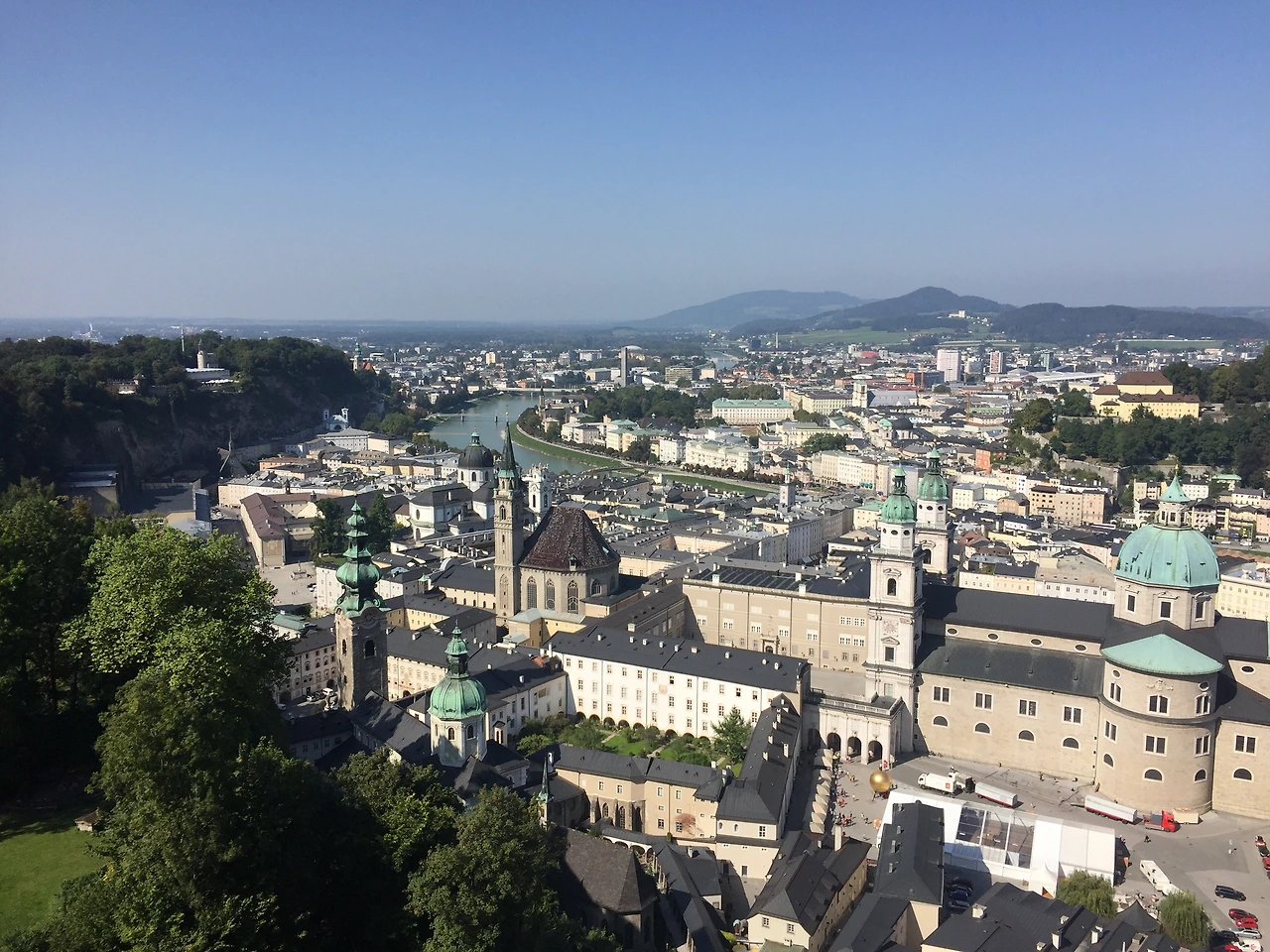 잘츠부르크 도심지를 조금 걷고 나면 언덕을 비스듬히 올라가는 산악열차를 타고 잘츠부르크 성에 갈 수 있다. 성에 오르면 잘츠부르크 시내와 함께 잘츠부르크 사이를 흐르는 강이 보인다. 높은 산 없이 중간에 언덕만 두고 펼쳐진 넓은 땅은 한국에서 보기 힘든 모습이다. 성에 있는 기념품 가게에도 잠깐 들렀는데, 이곳에서는 내가 쓰기 위해서 허브 소금을 샀던 기억이 난다.