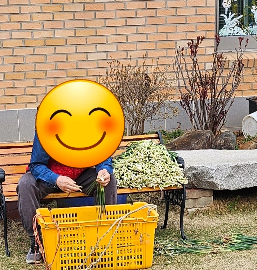 산더미처럼 쌓인 쪽파를 마당가 벤치에 앉아 까고 또 깠어요.
