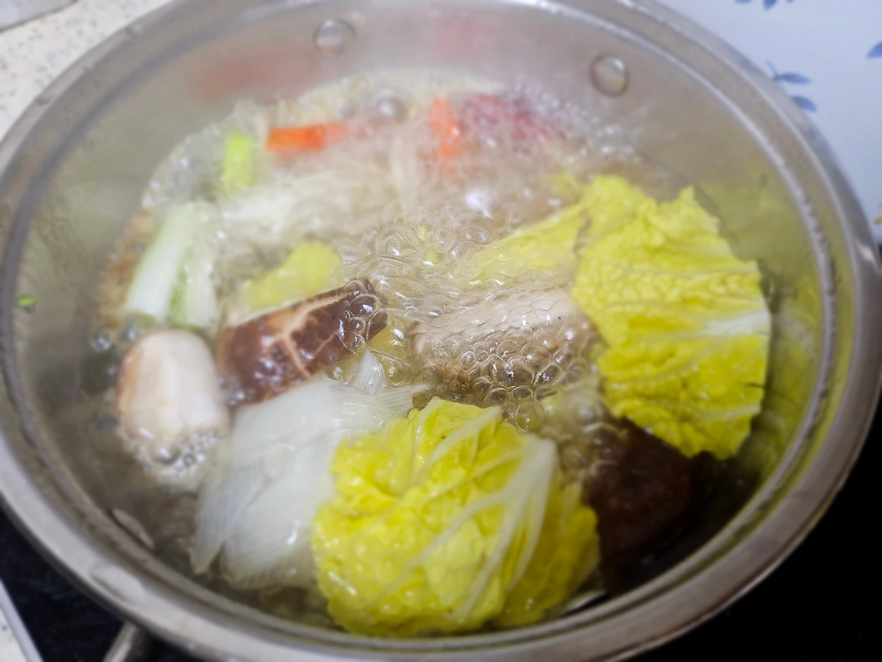 (계속 넣어 끓여도 되지만 깔끔한 채소육수 맛을 좋아해서 먼저 건져냅니다.) 중불로 줄여 15분 정도 끓입니다.