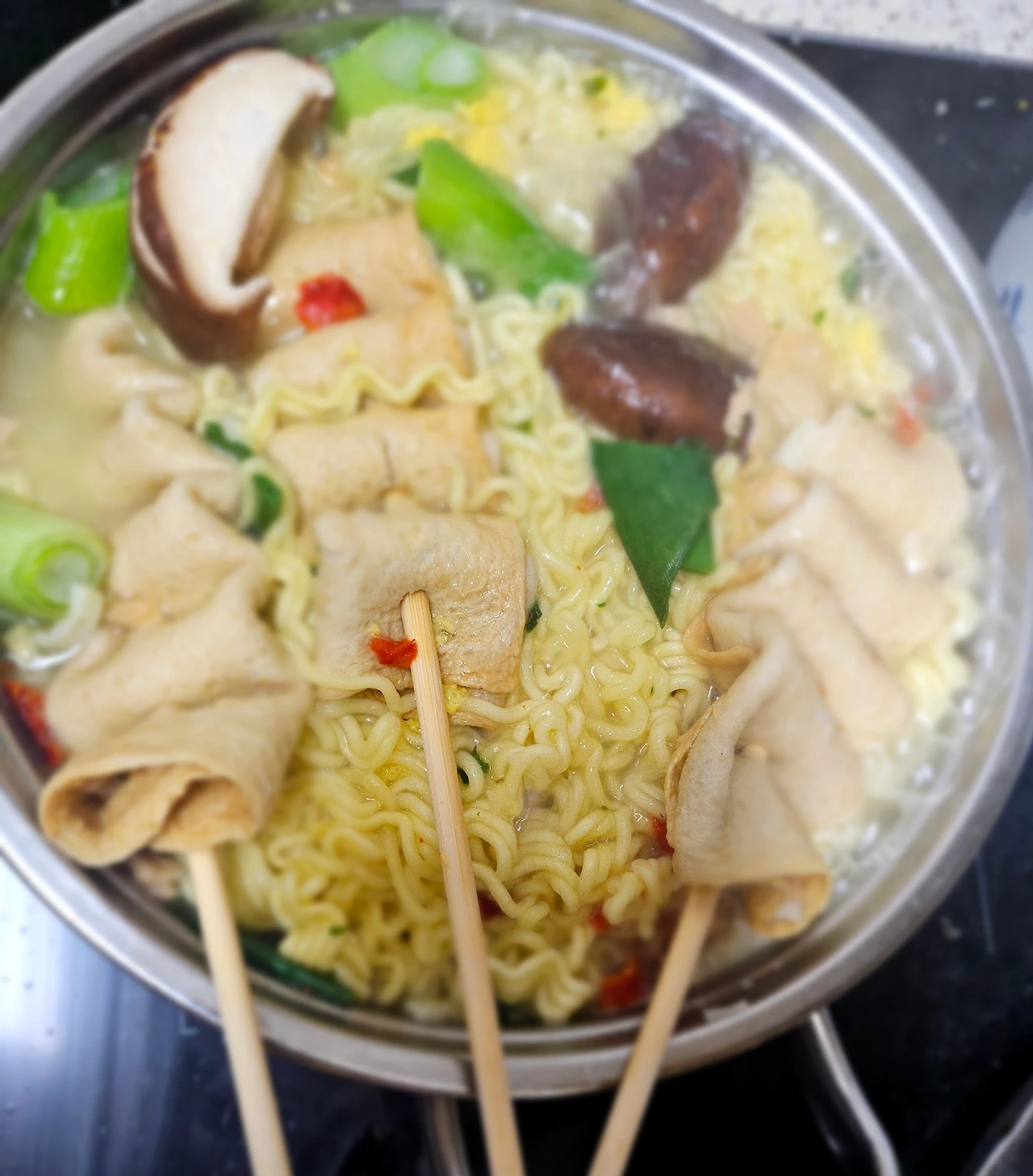 남은 국물에 라면 면만 추가해서 끓이다가 꼬치어묵을 올려주면 꼬치어묵라면까지 맛있게 먹을 수 있답니다. (국물이 너무 짜다면 뜨거운 물 반컵을 넣어주고 라면스프를 한꼬집 넣어주면 간이 맞더라구요 ㅎ)