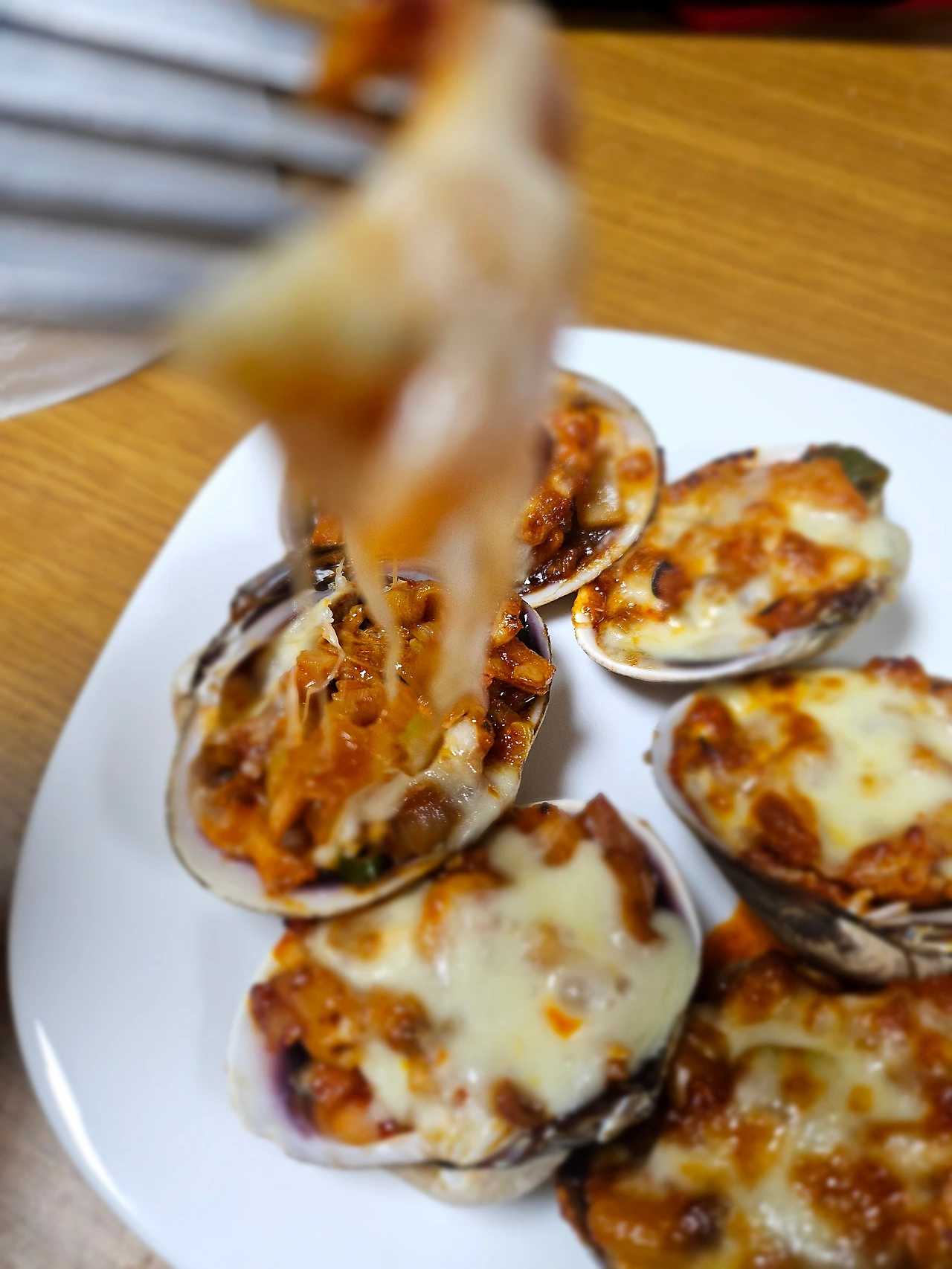 5.개조개 껍질에 4를 담는다. 조금 소복하게 올려줘야 먹음직스러워요