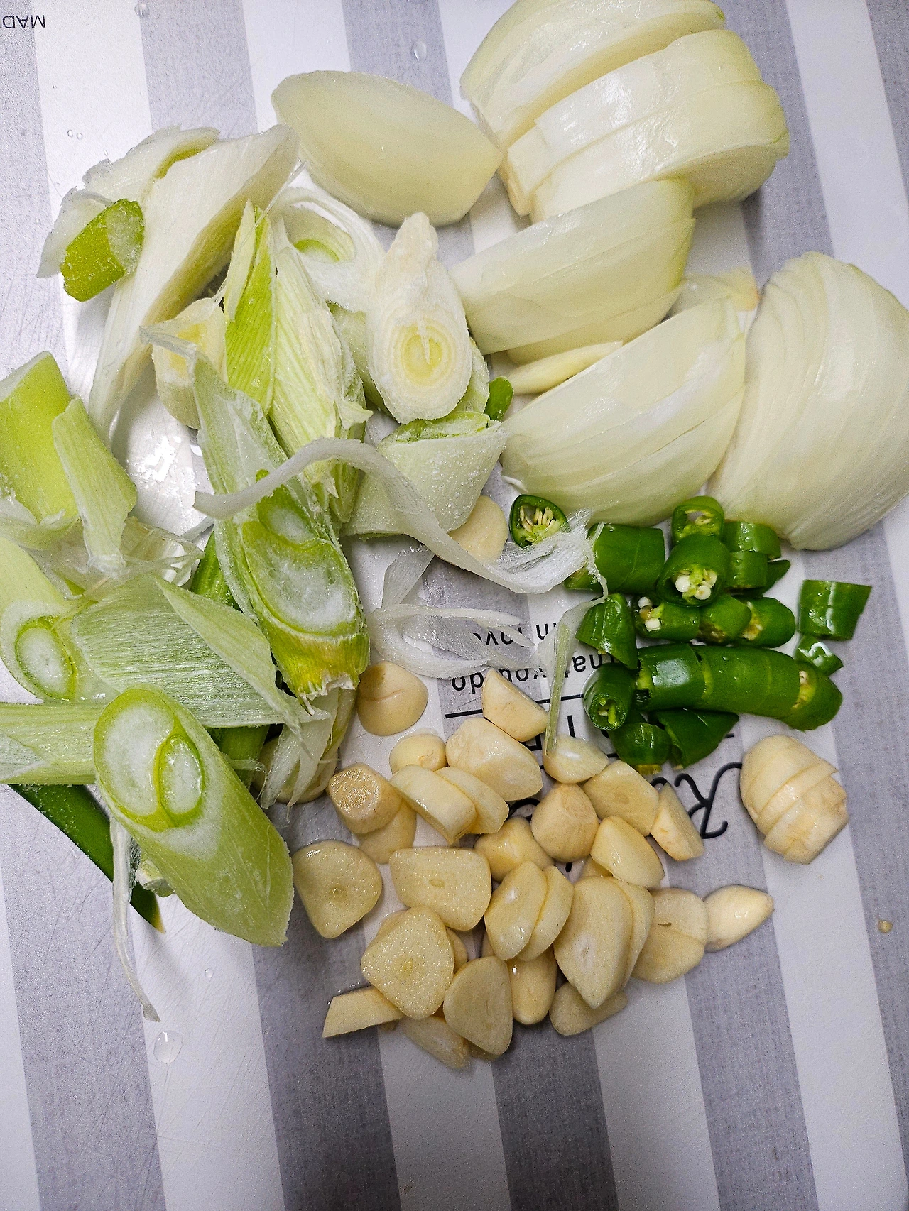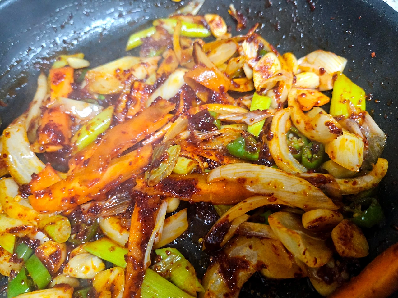 --예열한 팬에 기름두르고 센불로 대파 마늘 양파 땡초 당근순서로 볶아주고 불을 중불로 낮춘후 팬을 기울여서 그 기름에
