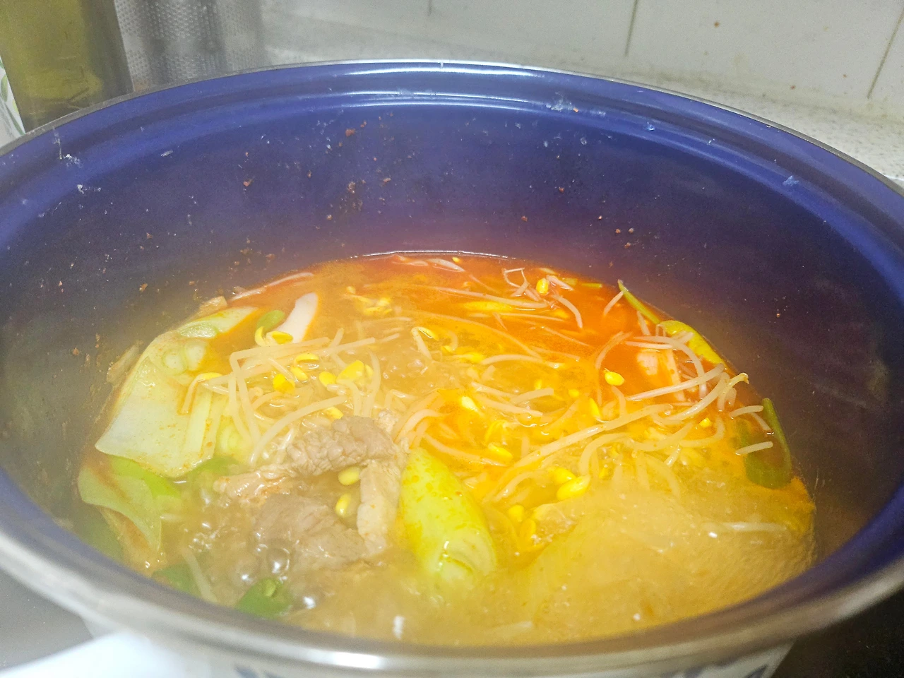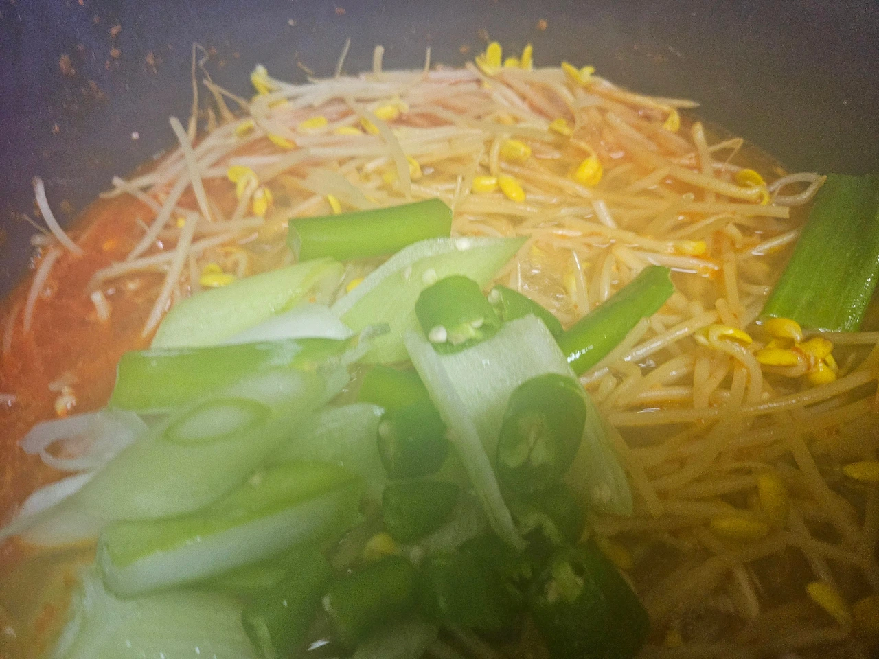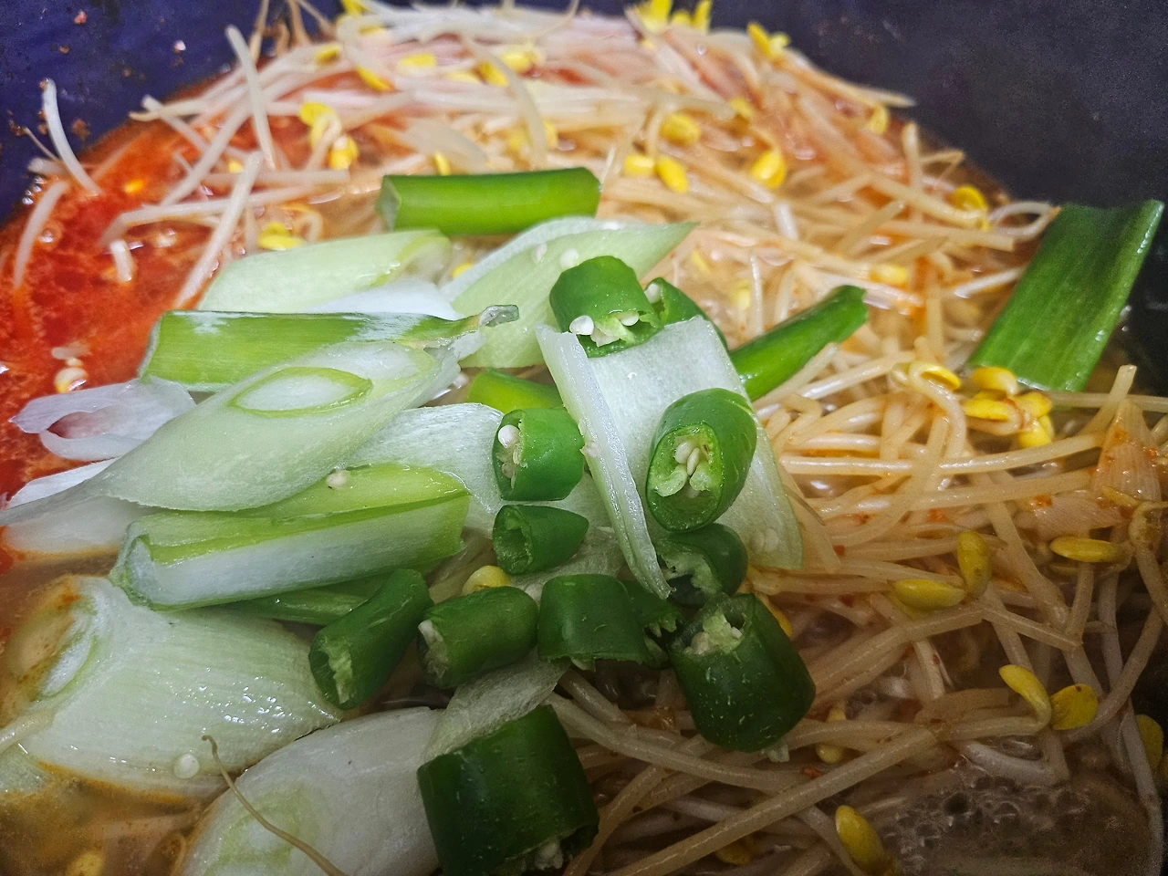 4. 물을 붓고 콩나물 대파 땡고추 넣어 끓여줍니다.