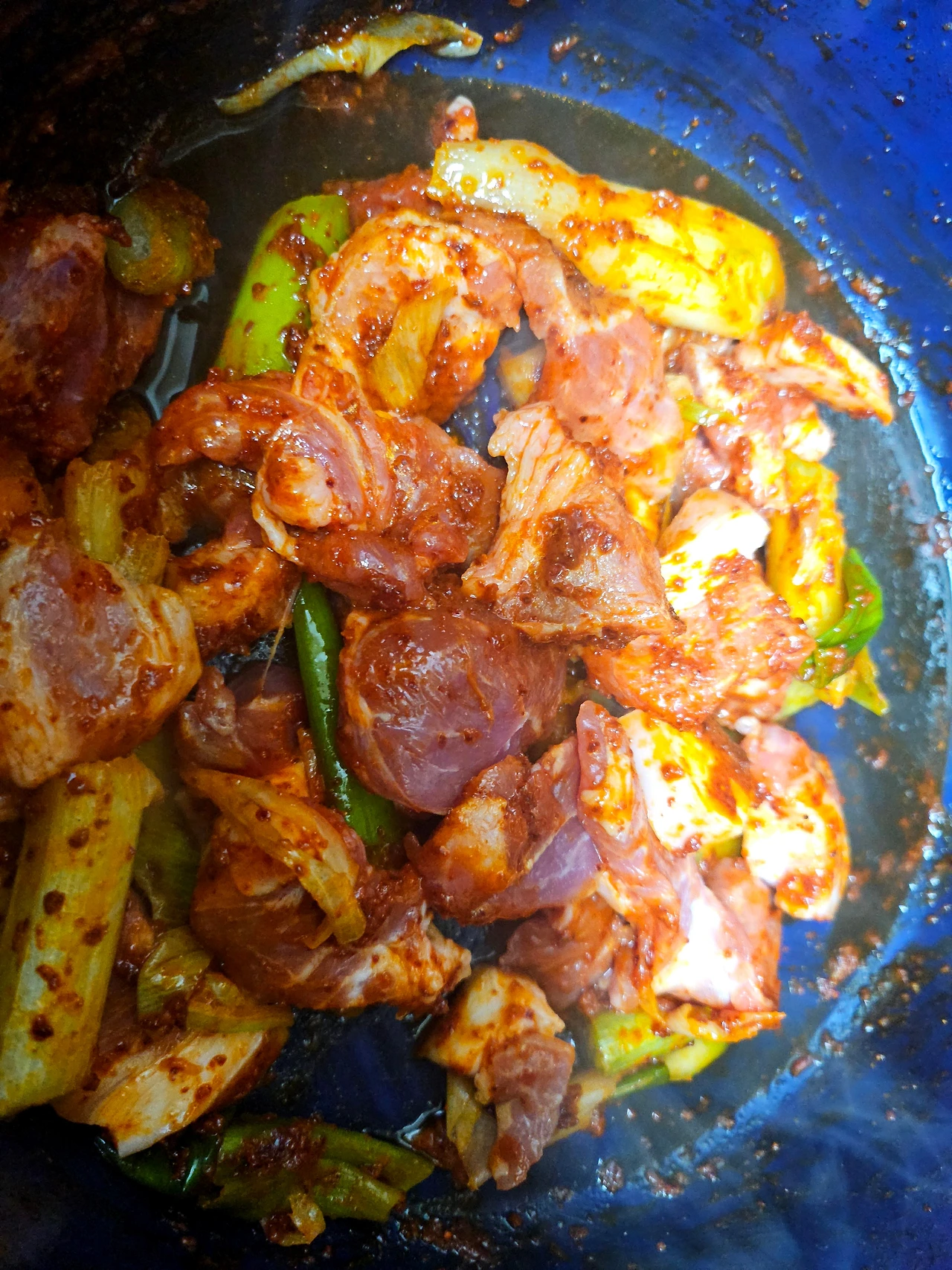 3. 여기에 돼지고기를 같이 볶아요. 이때 소고기 다시다 1/2숟가락 넣어주면 더 깊은 맛이 나요.