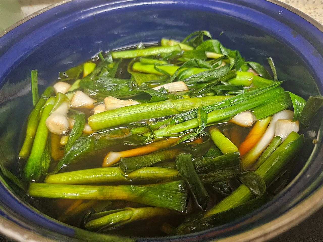 풋마늘을 끓는 간장물에 살짝