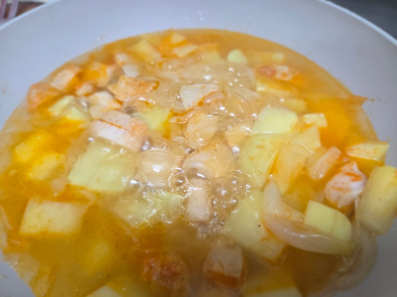 (양파익는동안 감자 당근 호박등을 채썰어요. 채소는 생략할건 해도 되요^^)