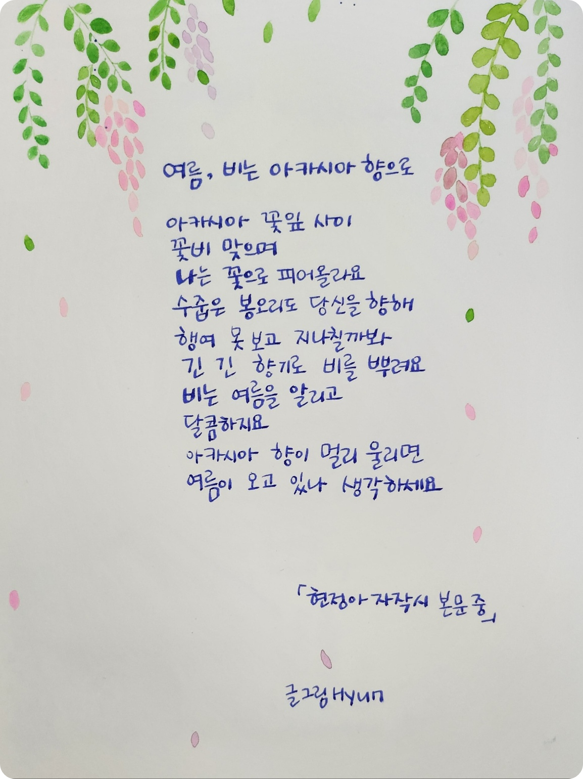 아카시아 꽃잎처럼 수줍은 사랑은 혼자 되뇌는 비밀스러움을 가지고 있으나 순수한 마음이라 여겨진다. 불타오르지 않으나 은은한 빛이다. 내리는 비는 여름을 알리고 아카시아 꽃물로 향기가 고와서 이내 번져가는 온화한 마음을 시로 끄적여 본다.