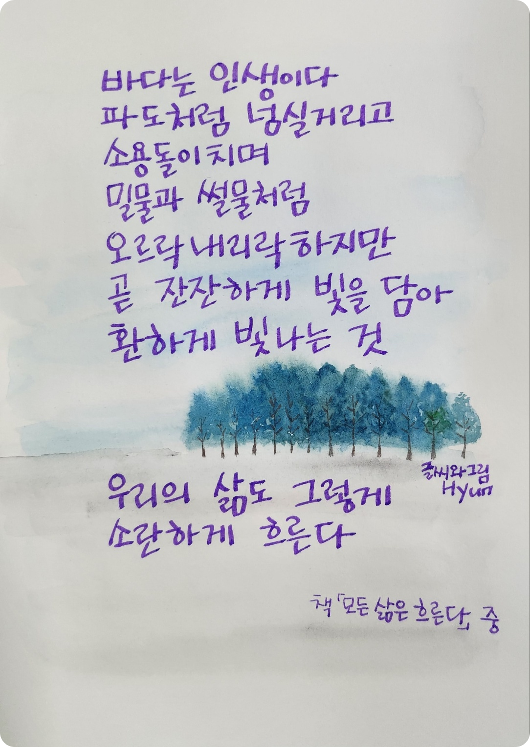 바다는 인생이다. 파도처럼 넘실거리고 소용돌이치며밀물과 썰물처럼 오르락내리락하지만 곧 잔잔하게 빛을 담아 환하게 빛나는 것우리의 삶도 그렇게 소란스럽게 흐른다.