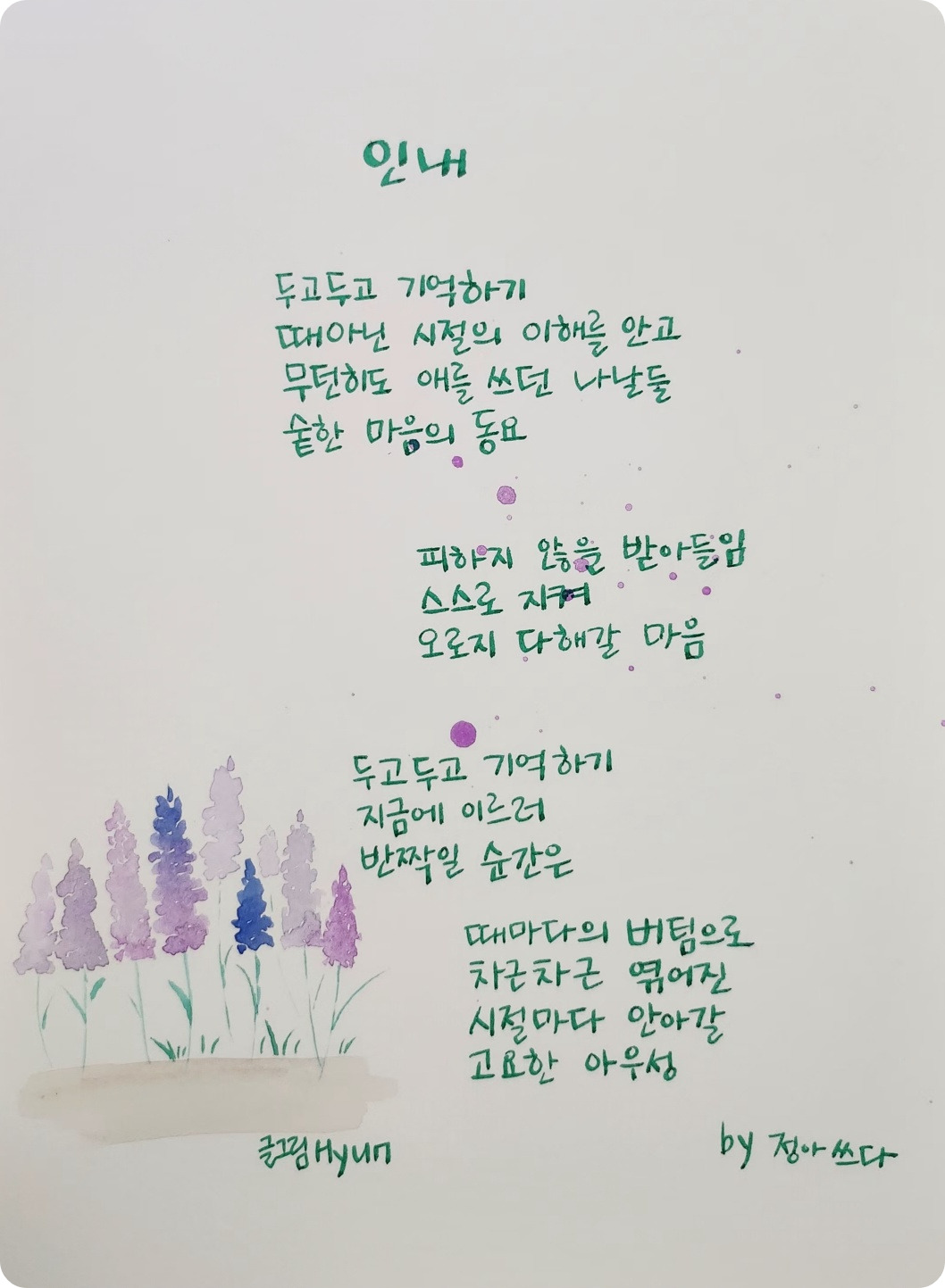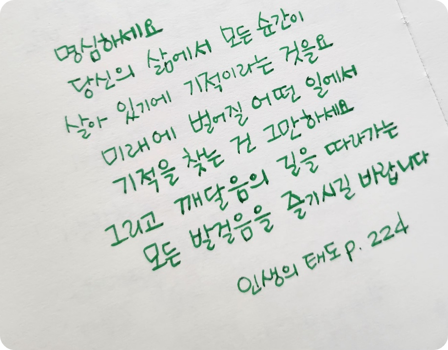 하나씩 이룬 과정이 나의 인내요. 그 인내는 물 밑에 빼진 나를 헤엄쳐 올라오게 할 버팀이 된다. 시절마다의 쓰러짐이 인내와 만나 나를 이룬 지금의 삶이 된다. 받아들임과 인내로 걸어간 과거와 지금과 미래는 서로 연결되어 흐른다. 그래서 지금 내가 만나 해내는 일들이 기적이기에 마음 쓰일 것들이 가치 있도록 좋은 마음 가득 품어가 본다. 나의 고요는 나의 시절을 빛나게 한다. 지금이라는 기적이 가장 가까이 있다. 자! 이제 무엇을 해야 할지 떠오른다. 너무나 자연스럽게.