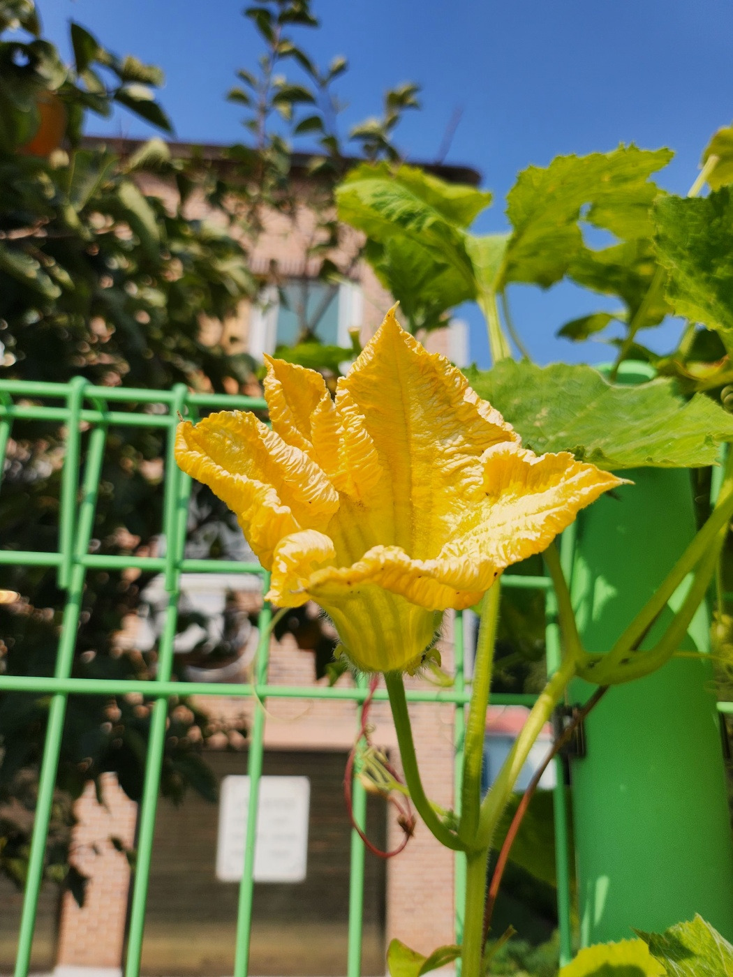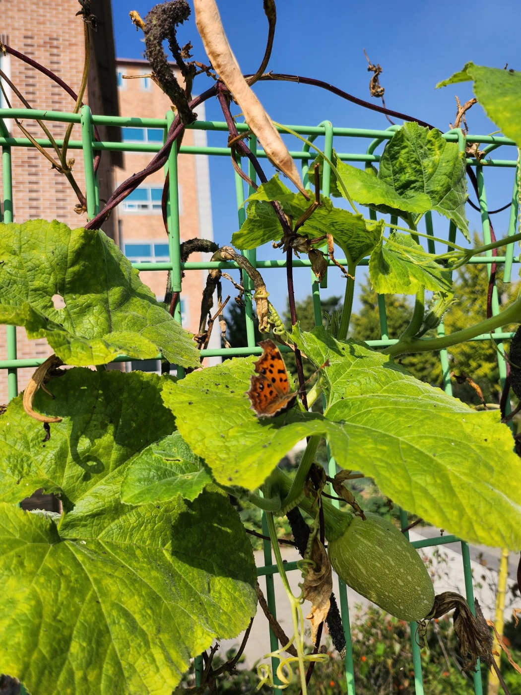 줄기가 시작된 지점부터 끝이 어디일지 눈으로 발을 옮겨 가며 살펴본다. 차근차근 보아 가는 나의 눈에 줄기를 따라 피어진 호박꽃이 배시시 웃고 있다. 가을의 풍성함이 노란 빛깔로 거기에 머물러 있었다. 나도 거기에 머물러 피어간다.