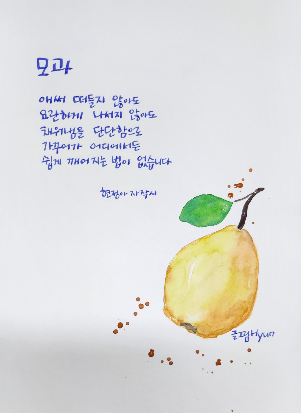 모과는 바닥에 떨어져 반점이 생기더라도 자신만의 향을 잃지 않는다. 겉의 모습보다 내면에 치중한 단단함은 오래도록 보아도 한결같은 모습이다. 나도 그런 단단함으로 이뤄가는 나날로 내면을 잘 만들어가는 사람이고 싶다. 시끄럽게 호들갑하며 보여줌에 치중하기보다 누가 보아주지 않아도 진득하게 여문 단단함이 마음으로부터 우러나와 가볍게 날리지 않도록 겉의 표정과 행동까지도 은은한 향기로 머물러지도록 살아가고 싶다.