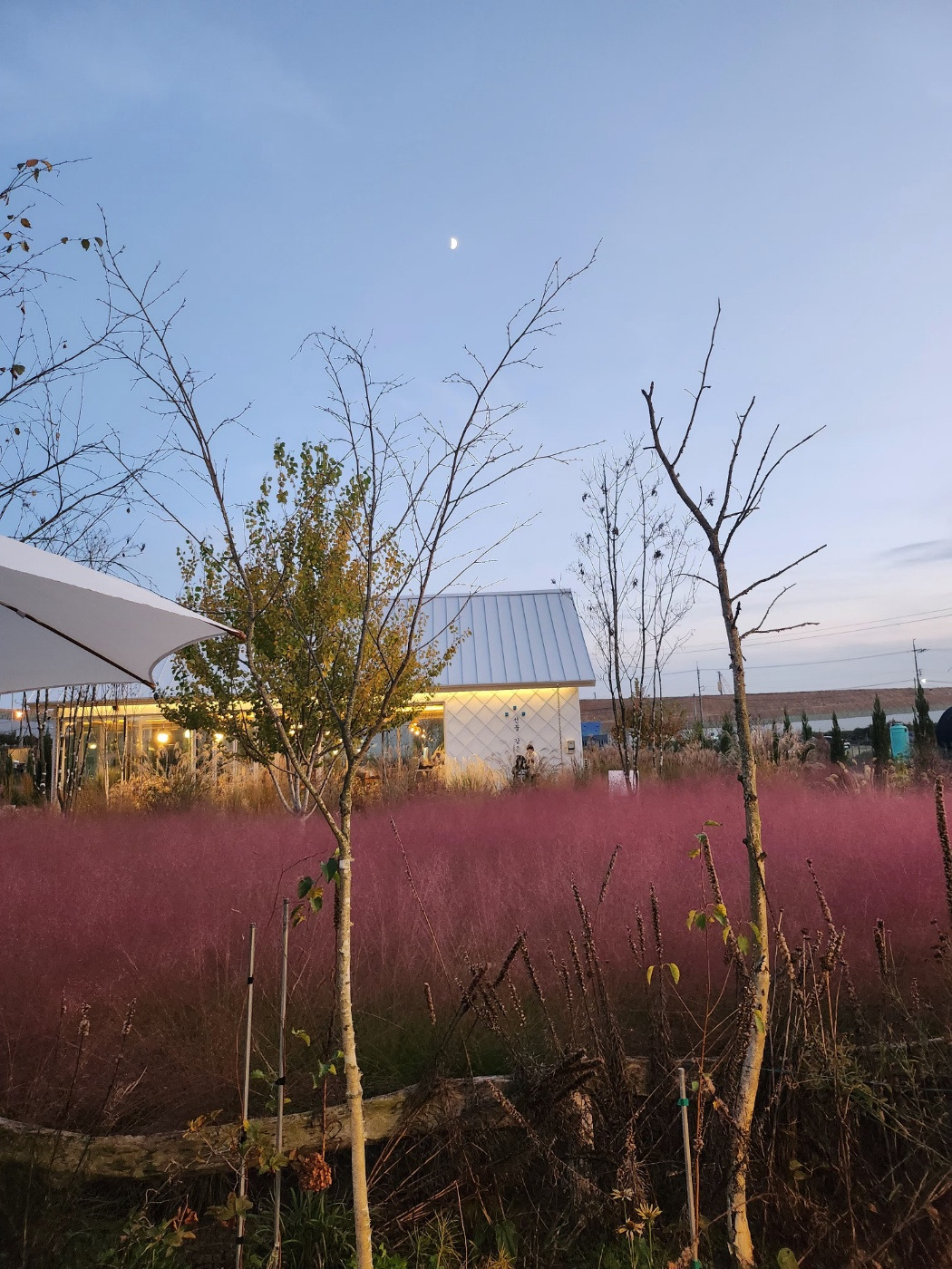 가족과 식물카페에 갔어요. 한적한 시골 농촌 마을 어귀 온갖 식물과 나무가 커피 향과 함께 가을을 즐기고 있어요. 정원이 소박하면서도 고급져요. 해와 달을 품은 계절이 여기 가득하네요. 어여쁜 풀꽃들과 갈대의 인사가 반가워요. 5월의 장미 정원은 내년을 기약하고 있어요. 하늘은 푸르고 가을은 깊지요. 핑크물리 꽃밭이 우리를 반겨주어요. 아담하지만 소담스럽게 열린 핑크뮬리에 마음을 빼앗겨요. 연한 분홍 빛은 몽글몽글 첫사랑처럼 아름다워요. 수줍은 사랑은 첫사랑 같아요. 바람에 이리저리 나부끼는 핑크물리가 꼭 하늘을 휘도는 포근한 구름 같아 내 맘도 포근해져요.