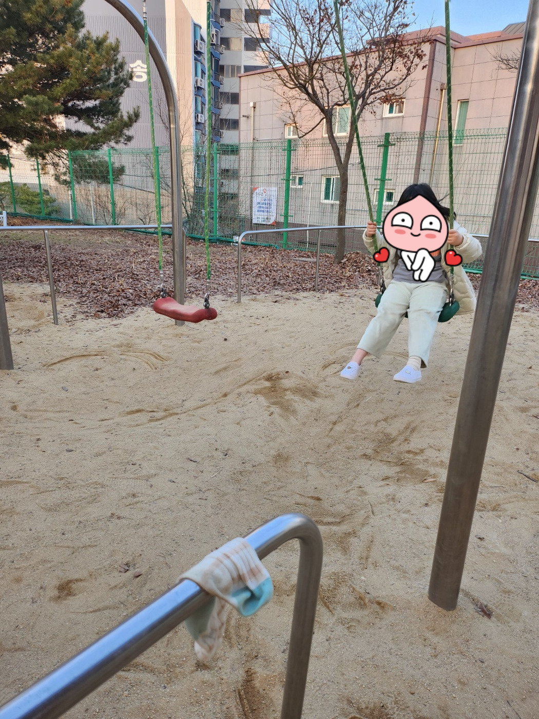 그네를 신나게 타는 아이가 엄마를 보고 “엄마!” 소릴 질러요. 엄마라는 말에 걸어가는 발걸음이 이내 빨라져요. 양손을 활짝 펴서 나도 아이의 이름을 크게 불러요. 아침에 보고 처음 보는 얼굴이라 얼마나 반가웠게요. 그네 위 아이는 기다리는 동안 혼자 그네도 타고 모래로 밟으며 놀았더라고요.