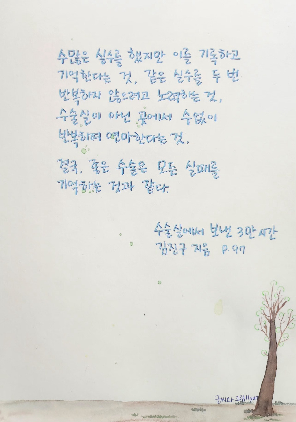 ♧ 수많은 실수를 했지만 이를 기록하고 기억한다는 것, 같은 실수를 두 번 반복하지 않으려고 노력하는 것, 수술실이 아닌 곳에서 수없이 반복하여 연마한다는 것. 결국, 좋은 수술은 모든 실패를 기억하는 것과 같다. p.97