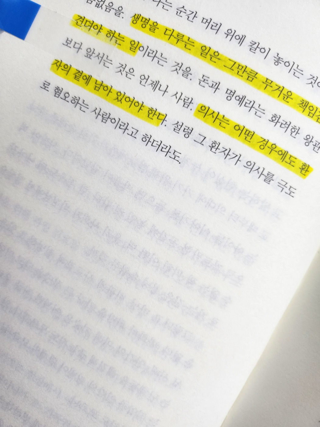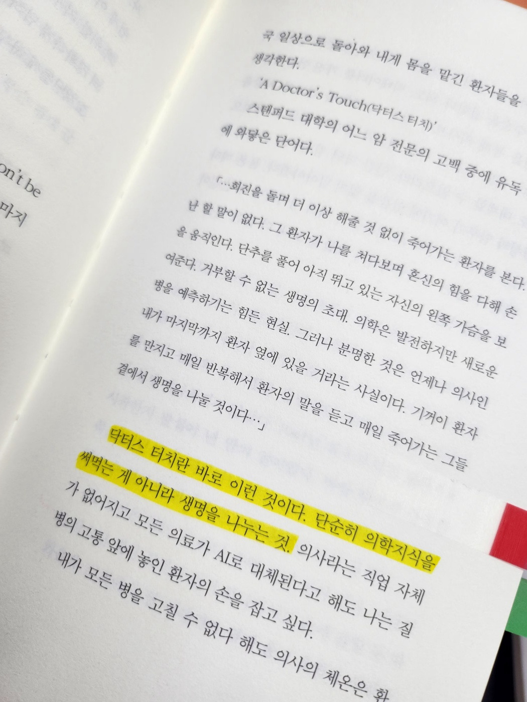 ♧ 닥터스 터치란 바로 이런 것이다. 단순히 의학지식을 써먹는 게 아니라 생명을 나누는 것. 모든 의료가 AI로 대체된다고 해도 나는 질병의 고통 앞에 놓인 환자의 손을 잡고 싶다. p.57