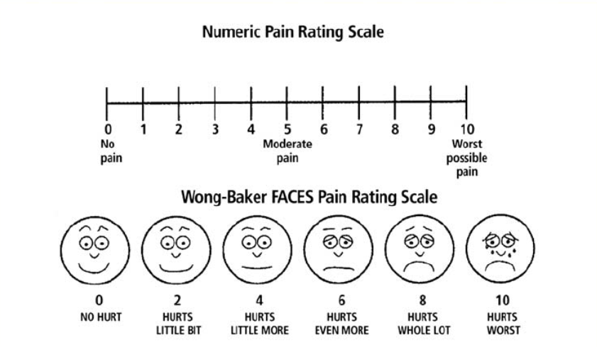 통증을 평가하기 위해서는 통증 사정 도구를 이용하게 된다. 숫자 개념을 아는 성인의 경우 0에서 10까지의 숫자 중 가장 근접한 정도의 통증 정도를 숫자로 표현하는 것이다. 이것을 우리는 NRS(Numeric Rating Scale)라고 한다. 이 척도는 성인뿐 아니라 수 개념을 이해하는 12세 이상에서 사용할 수 있다.