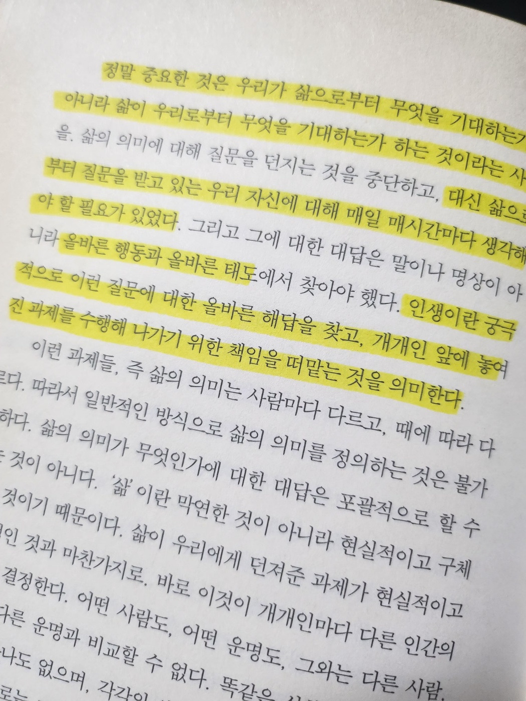 인생이란 궁극적으로 이런 질문에 대한 올바른 해답을 찾고, 개개인 앞에 놓인 과제를 수행해 나가기 위한 책임을 떠맡는 것을 의미한다. p.138