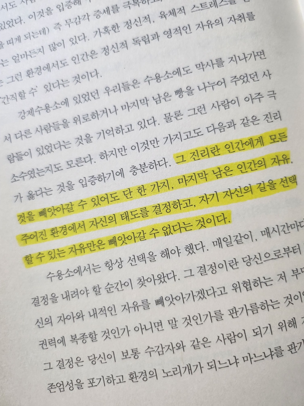 수감자가 어떤 사람이 되는가 하는 것은 그 개인의 내적인 선택의 결과이지 수용소라는 환경의 영향이 아니라는 사실이다. 강제수용소에서도 인간으로서의 존엄성을 지킬 수 있다. p.121