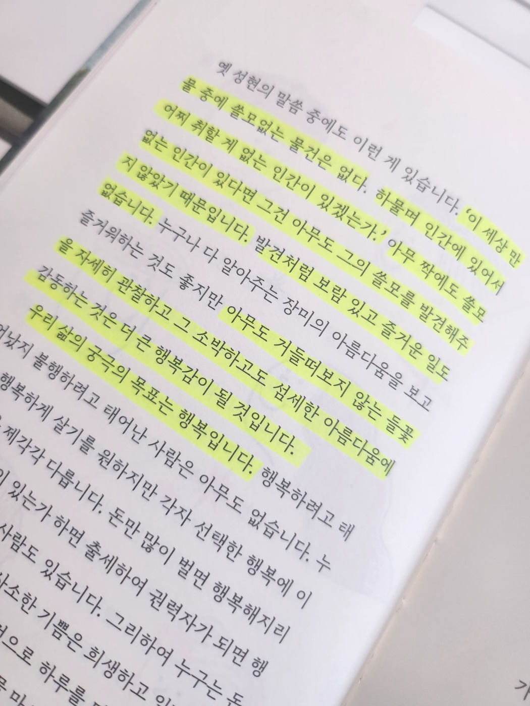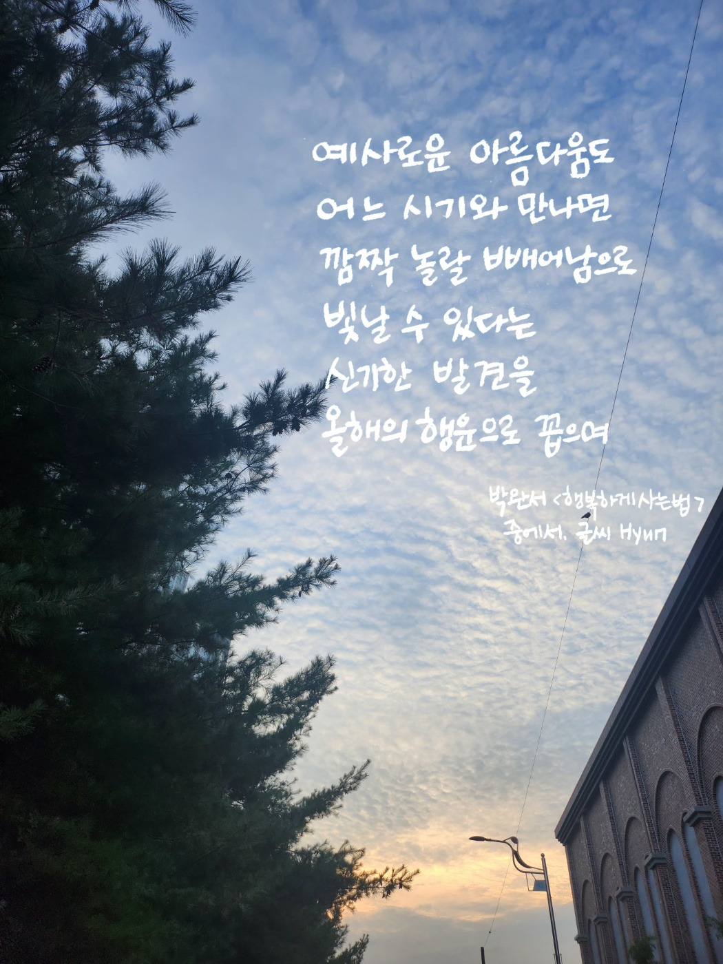 주말은 일주일을 쉴 수 있는 유일한 낙이다. 멀리 어디를 가야 한다거나, 쇼핑을 하며 지루함을 달래는 것도 좋지만 나는 가족과 맛있는 것을 먹거나 홀로 조용히 앉아 책을 읽고 필사를 하며 공감의 문장을 만나 이루는 시간들이 좋다.