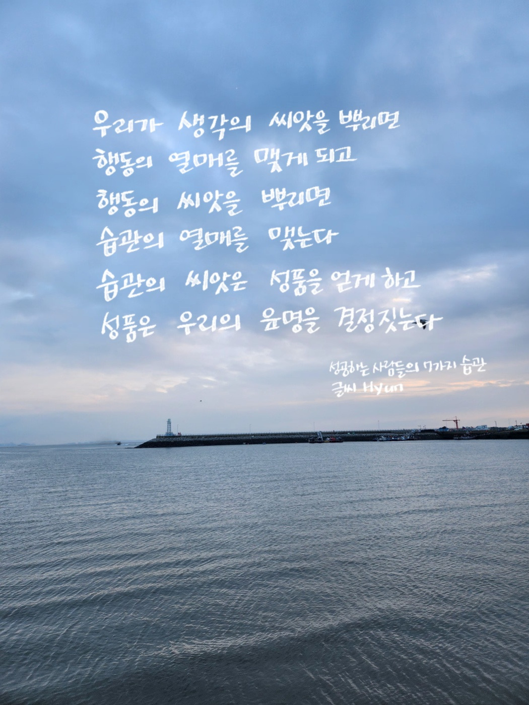 지치지 말고 꾸준히 나아가는 일 속에 좋은 생각과 습관을 녹여내는 일이야말로 멀리 내다보았을 때 오랜 힘을 발휘할 수 있는 영향력을 주게 되리라. 내일의 날들은 또 다른 나의 하루가 된다. 하루는 같지만, 그 안에 다른 일들이 얼마든지 벌어진다. 그렇기에 하루는 같지 않다. 날마다 나는 어떤 마음을 녹여낼 것인가! 좋은 습관으로 말미암아 이룰 일들이 내게 이롭게 되도록, 탁월함을 이루도록 하나의 마음을 다잡는다.