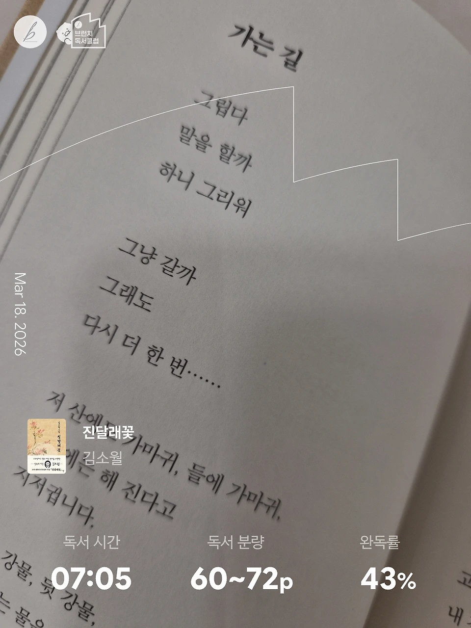 2가는 길 시/김소월 그립다 말을 할까 하니 그리워 그냥 갈까 그래도 다시 더 한번 p.64 ---- <수요일의 시와 비> 그리워 그리워 가는 길 내내 사무치던 그 마음 보일 듯하다.진달래꽃by현정아17일 전