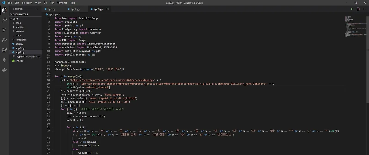 사실 기존에 짜놓은 뉴스 모니터링 페이지와 단어 빈도 분석기 코드를 적절히 조합하면 손쉽게 만들 수 있으리라 생각했다. 그러나 착각이었다. 네이버 뉴스 페이지를 한 페이지만 크롤링하는 것은 쉽지만, 10페이지를 모두 한곳에 담았다가 텍스트를 추출해 분석하는 작업은 꽤 어려웠다. 이틀 내내 고심한 끝에 pandas의 DataFrame 관련 명령어 중 to_string()에서 답을 찾았다. 결국 일요일 자정이 다된 시간에 허겁지겁 글을 쓰고 있다. 역시 무슨 일이든 얕보면 안 된다.