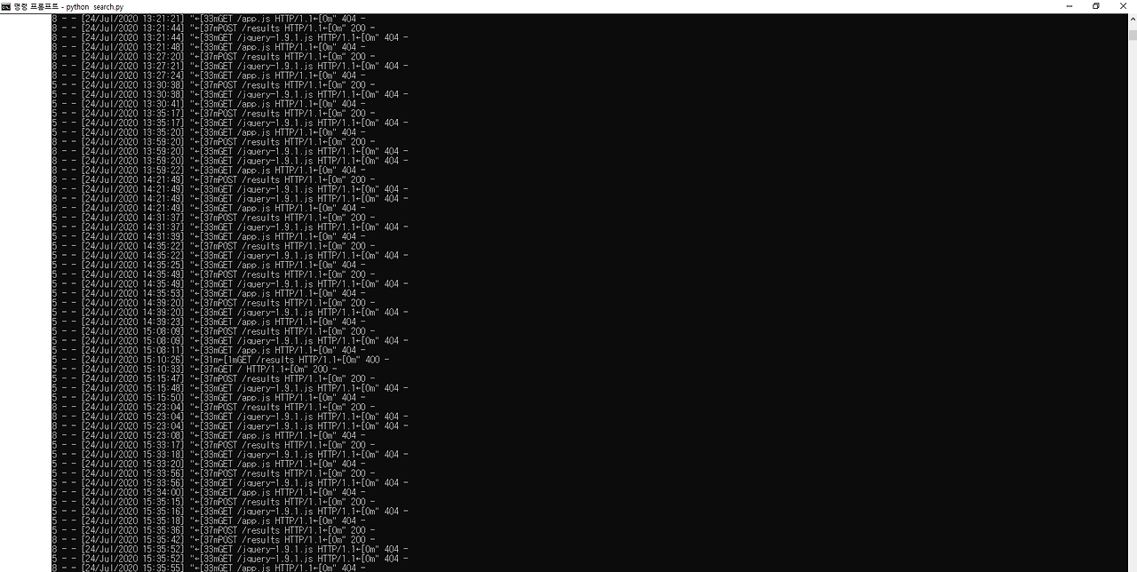 사보를 만들 때 교열 전문가가 이틀정도 함께 작업한다. 그분들은 최소 10년 이상 잡지, 전문지, 사보를 비롯한 각종 간행물의 글을 다듬어오셨다. 매번 나의 문장 또한 그분들에 의해 바뤄진다. 나는 그분들을 '선배'라고 부른다. 저번주에 교열 선배가 SKS를 유용하게 쓰시는 모습을 보고 기뻤다. 내 글이 좋은 평을 들었을 때 만큼이나 기뻤다. 현재 내 컴퓨터가 SKS의 서버 역할을 하고 있는데, 아래와 같이 커맨드창에 접속 및 검색 기록이 뜬다. 맨 왼쪽 끝이 5로 끝나는 것이 교열 선배 자리 컴퓨터의 IP다. 여러 차례 키워드를 검색하신 걸 보니 유용하게 쓰신 것이 분명하다. 이밖에 팀원들도 모두 쓸모를 체감하는 듯하다. 감사한 일이다. 독자 중 혹시 코드가 궁금한 사람이 있다면 아래 메일로 연락 주시라.