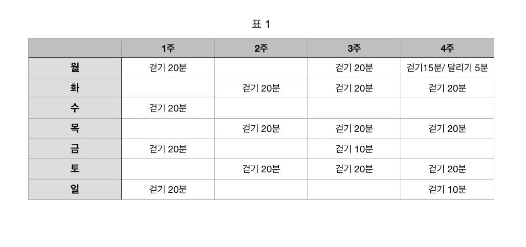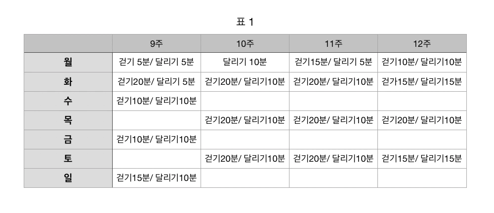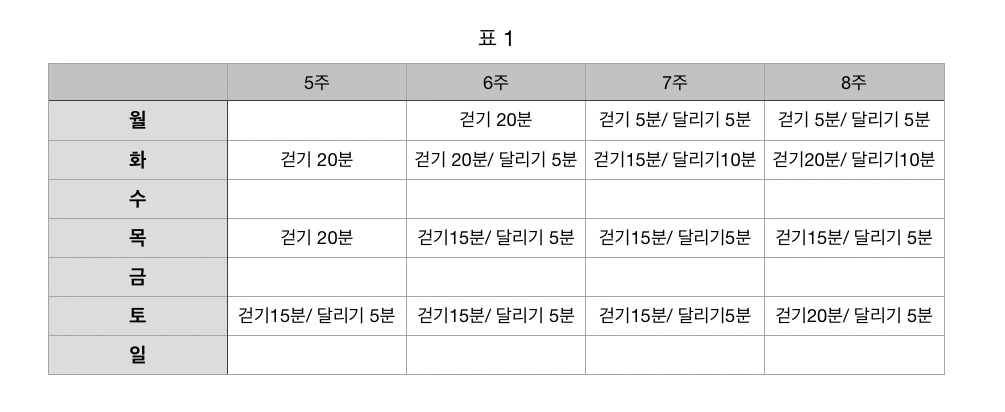 첫 3주는 걷기만 한다. 부상에도 돌아 왔거나 오랜만에 다시 운동한다면 특히 기초 체력이 없는 초보같은 경우에는 초반 3주는 달리기를 자제 해주는게 좋다. 걷기에 집중해주고 3주 후에 천천히 달리기를 시작 해준다. 초기에 부상이나 스트레스 때문에 할수없는 경우가 발생 할수있다. 내가 편하게 느끼는 것과 달리 몸은 스트레스를 받을 수있다.