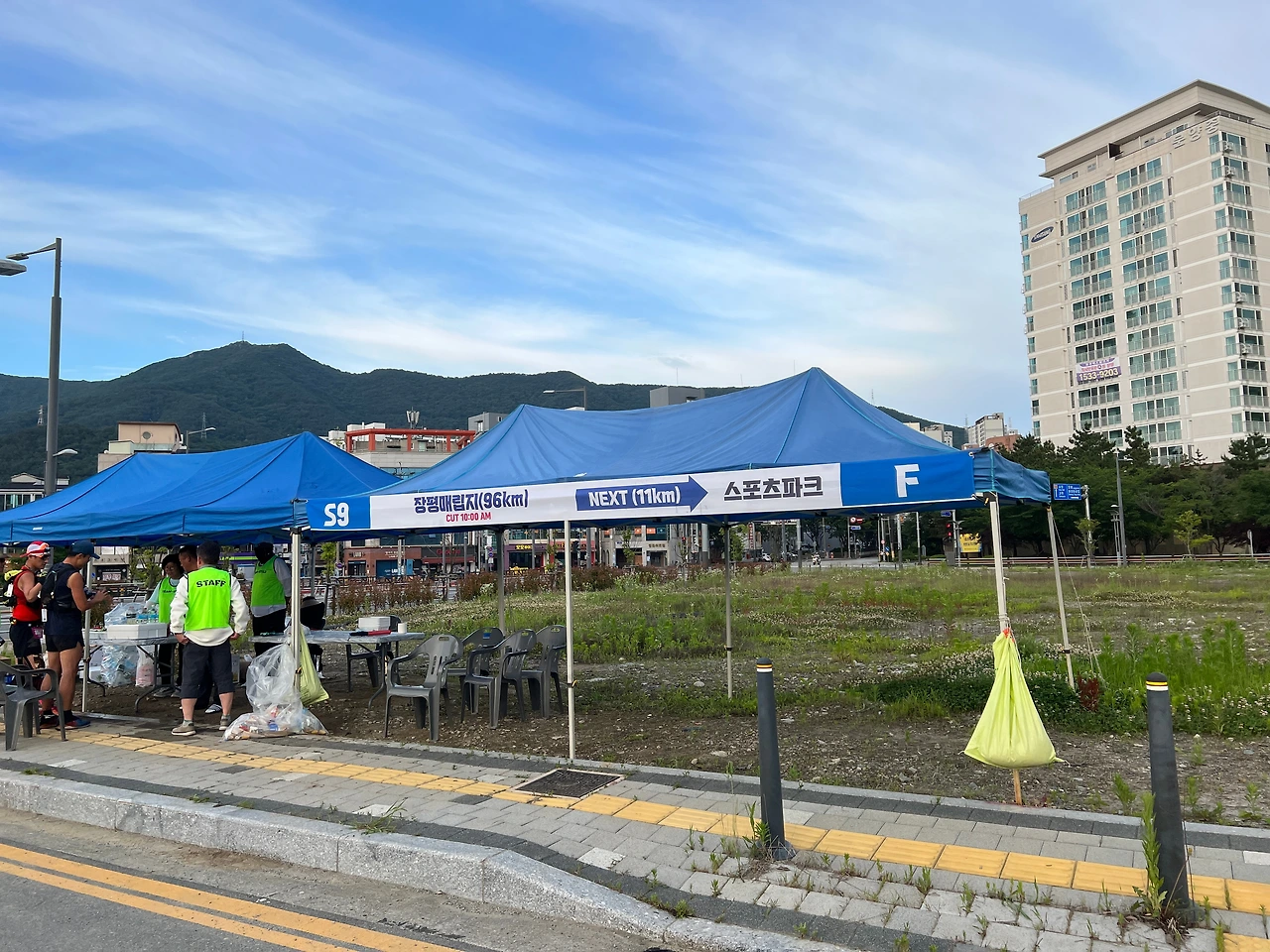 지독히도 끝날거 같지 않던 앵산을 넘어오며 마지막 CP까지 평탄한 도로길로 들어섰다. 어둠도 완전히 사라지고 온 세상이 환해지고 있다. 헤드렌턴을 집어넣고 내달리고 싶지만 이미 몸은 진이 다빠진 상태다. 뛰어지지가 않는다. 마지막 CP까지의 거리는 대략 96km다. 4km만 가면 끝이기에 마지막 피니쉬 라인에서 달리기 위해 힘을 이껴두기로 한다.