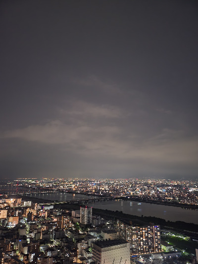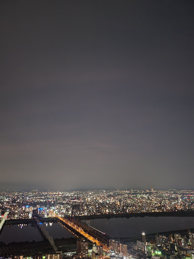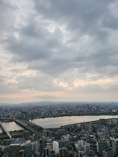 일몰 전이라 야경은 아니지만, 해가 뉘엿뉘엿 넘어가며 햇살로 뜨거웠던 하루가 저물어 가는 뜨거운 푸른색과 식어가는 회색이 섞여 있는 배경에 오사카라는 풍경이 담겨 있는 걸 보고 있으니 하루의 고됨이 싹 가셨다.