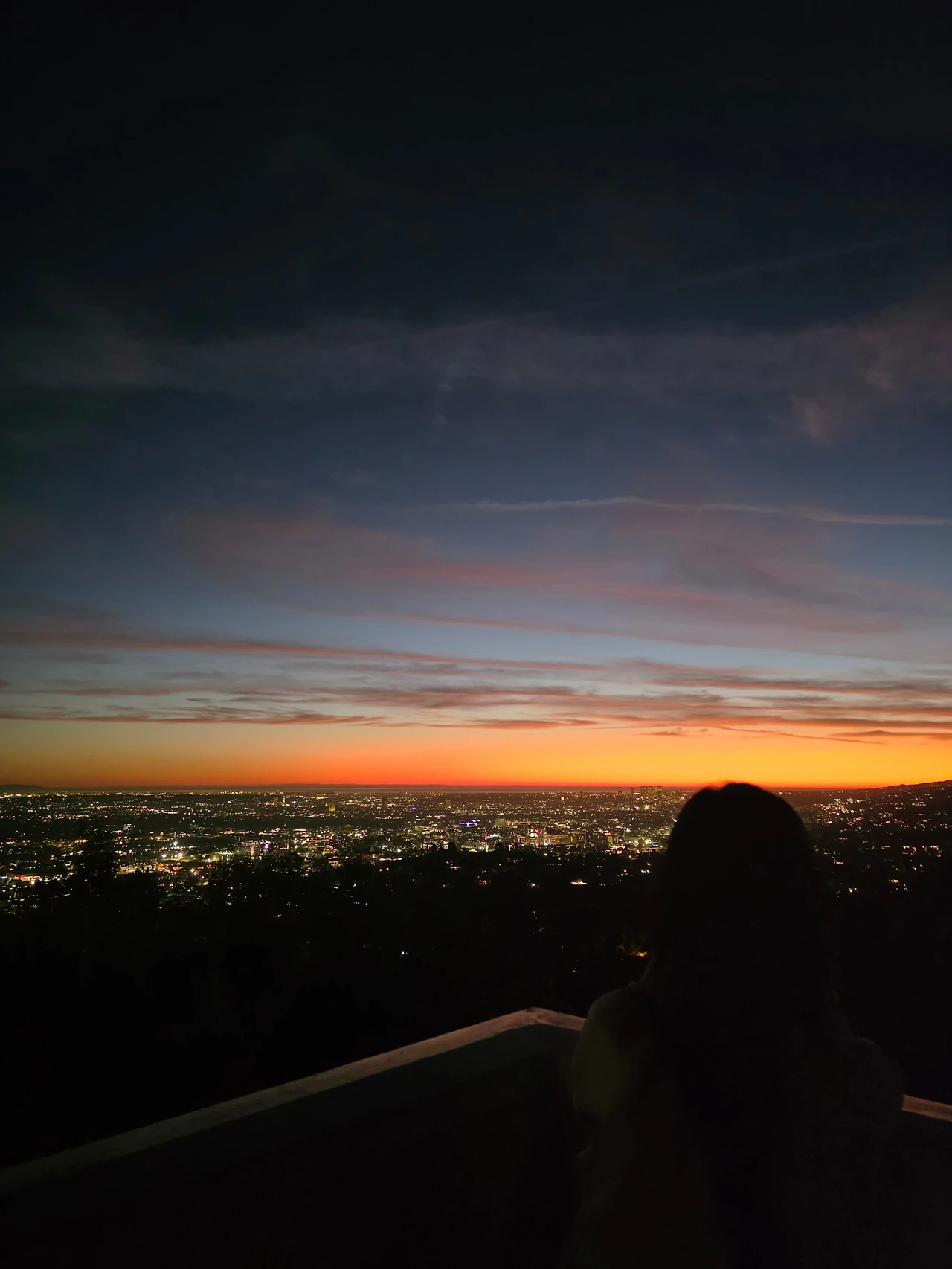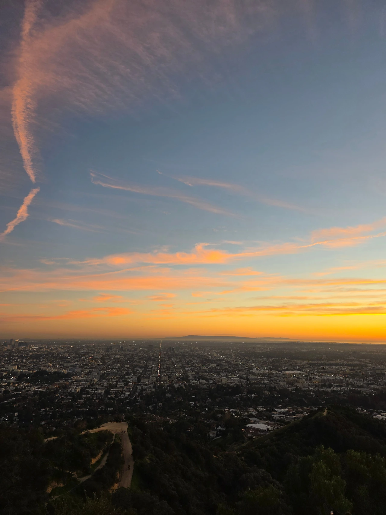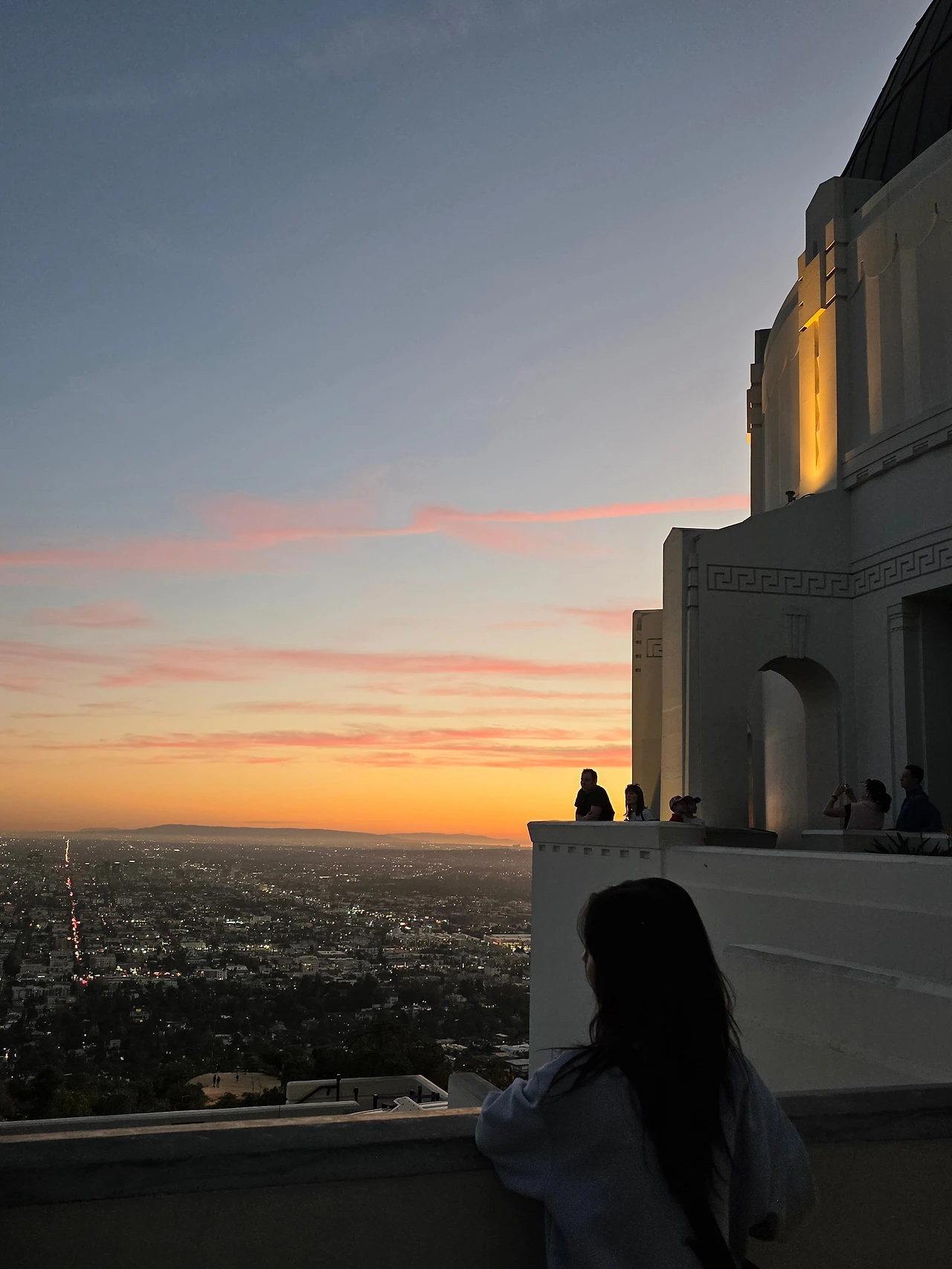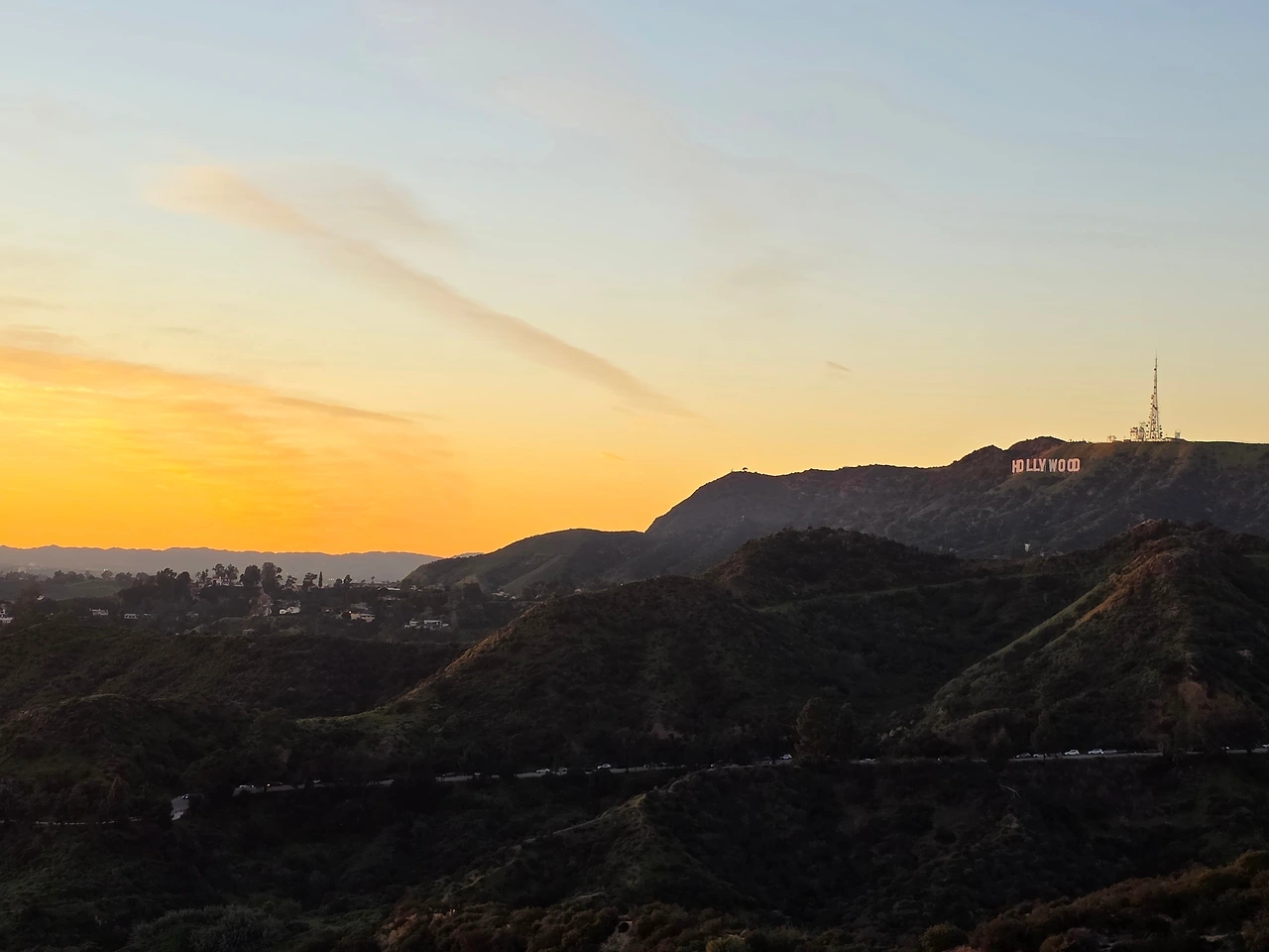 버스를 타고 5분 정도 올라가니 금방 도착했다. 내리니 오후 다섯 시가 조금 넘은 시간이었고, 해가 막 지기 시작하고 있었다. 저 멀리 석양과 함께 할리우드 사인이 보였고, 조금 더 걸어 올라가니 노랗게 물든 LA 시내가 한눈에 들어왔다.