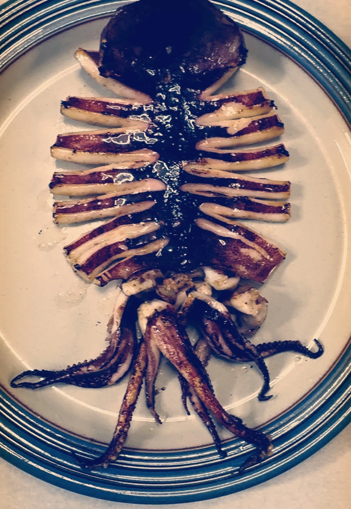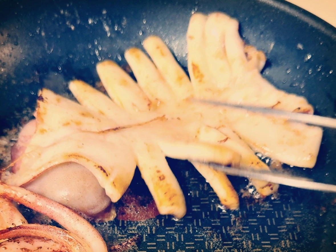 프라이팬에 버터를 넣고 녹여 오징어를 구워주면 된다. 이때 오징어가 잘 익고 고소한 버터향이 베어 들고 잘 익을 수 있도록 칼집을 내주는 게 좋다. 마지막에 설탕을 살짝 뿌려주고 불을 끈다. 그럼 달콤하고 살짝 캐러멜 같은 맛이 난다.