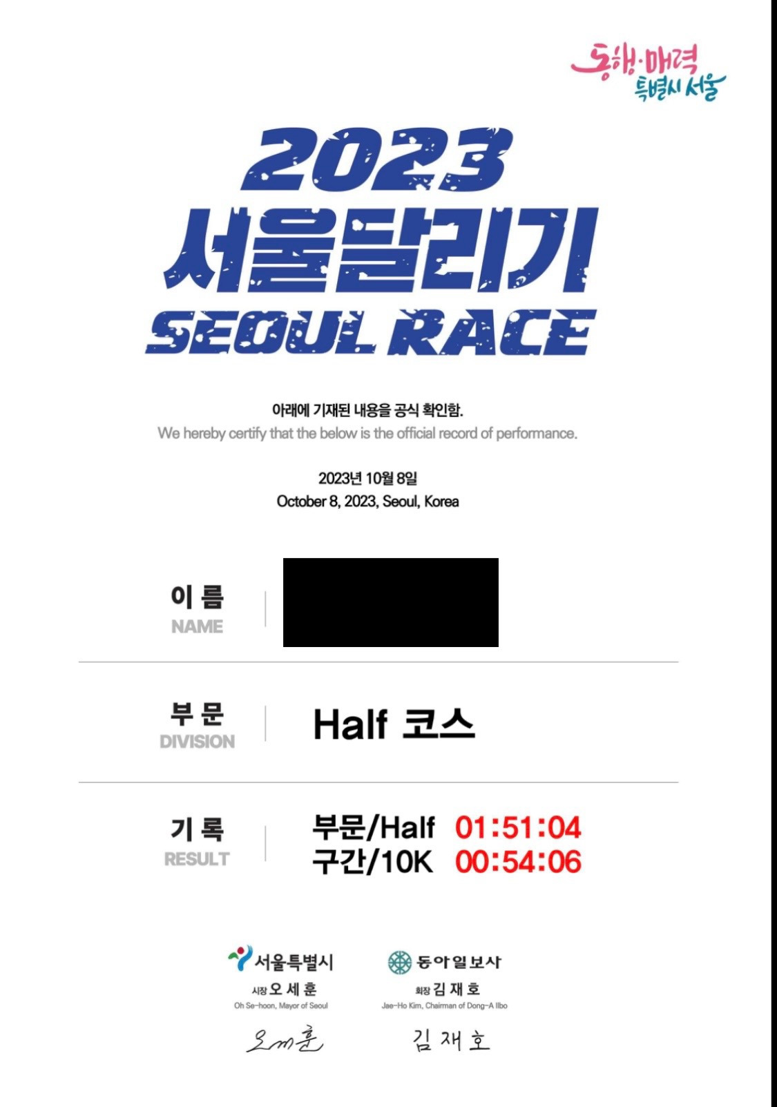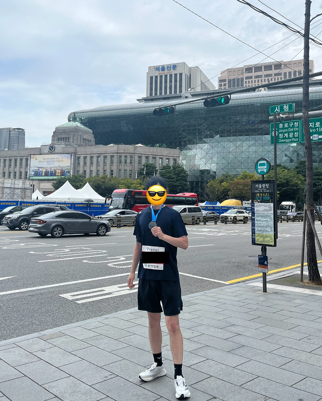 광활한 세종대로를 따라 우리의 달리기가 시작됐다. 눈앞에는 이순신 장군의 동상이 우뚝 서있었고, 동상을 지나자 곧 웅장한 광화문이 눈에 들어왔다. ‘서울 달리기 2023‘이라는 대회의 이름에 걸맞게, 정말 서울을 달리는 기분이 물씬 났다. 초반에는 사람들이 많아 1km에 5분 43초라는 페이스로 광화문을 향해 천천히 달렸다. 광화문에서 우회전하여 경복궁 돌담길을 따라 달리기 시작했다. 왼쪽에는 고궁의 돌담길이, 오른쪽에는 현대적인 상가가 늘어서 있어, 과거와 현재가 공존하는 독특한 공간 속을 달리는 듯했다. 주행코스가 다른 대회보다 약간 좁았기에, 사람들 사이를 뚫고 앞으로 나아가기가 어려웠다. 그래서 나는 욕심을 버리고 다른 이들의 발걸음에 맞춰 천천히 달렸다. 그렇게 우리는 청와대 방향으로 계속 나아갔다. 청와대로 가는 경사진 길은 힘들 것으로 생각했지만, 부대의 언덕길을 수백 번 오르내리던 것이 도움이 되었는지 전혀 힘들게 느껴지지 않았다. 돌담길을 따라 계속 달리다 보니 어느덧 3km 지점에 도달했다. 우리는 다시 세종대로로 진입하여 숭례문 방향으로 달리기 시작했다. 이때까지의 평균 페이스는 1km에 5분 42초였다. 초반의 페이스를 유지하며, 나는 서울의 거리를 내 발아래 느끼며 달렸다.