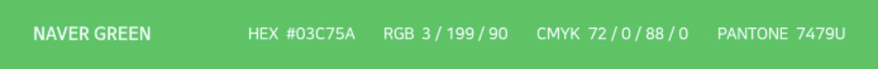 (1) Naver Green : HEX #03C75A GRB 3/199/90. CMYK 72/0/88/0. Pantone 7479U