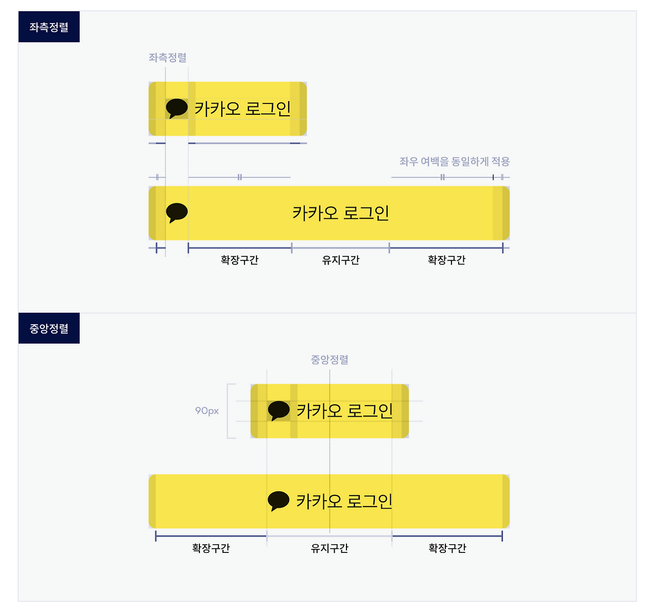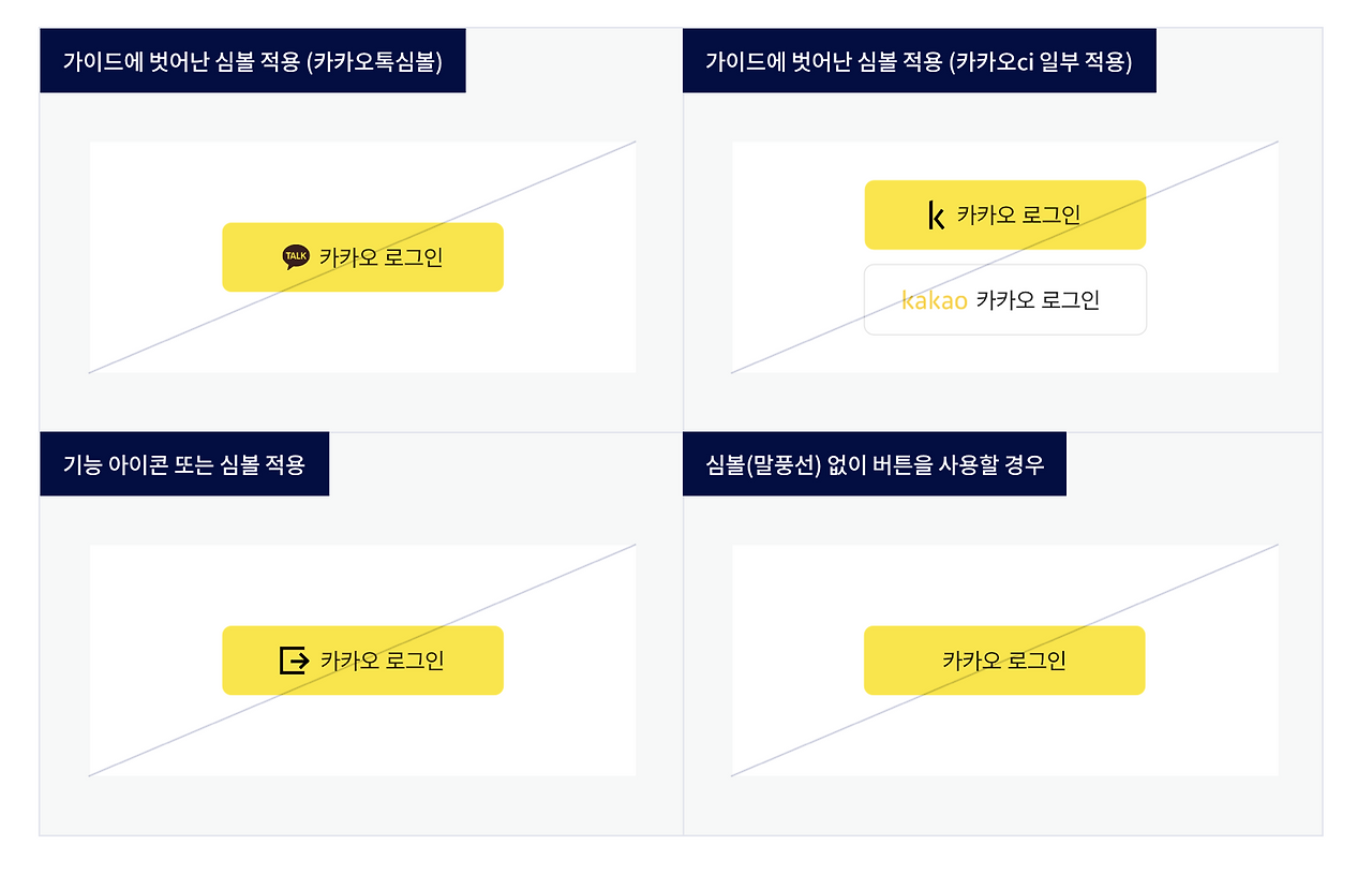 제한 사항으로는 카카오 고유 색상, 레이블 표기, 심볼 사용, 컨테이너 박스의 굴곡, 로그인 버튼 크기 변경에 따른 정렬 기준이있다.