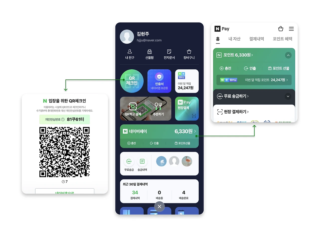들고 다닐 수 없는 PC와 다르게, 핸드폰은 들고 다닐 수 있다. 이러한 디바이스 특성을 잘 이용해 모바일 홈페이지에서는 네이버 페이 결제뿐만 아니라 QR 코드를 생성, 빠른 체크인을 할 수 있는 트랜드에 맞는 기능을 바로 넣어두었다. 또한 PC처럼 텍스트를 써서 리스트 형식으로 만드는 게 아니라 메뉴와 기능에 따라 카드형으로 만들었다. 카드형에 굴곡을 주어 딱딱한 느낌을 피하고, 서로 분리되어 보이도록 만들었다.