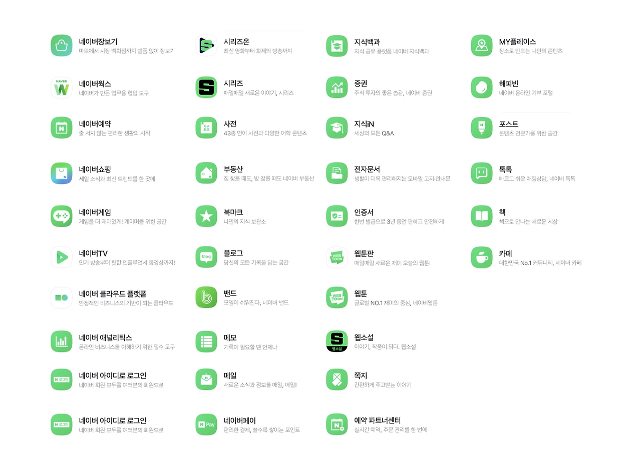 초록창이라는 별명에 맞게 ‘네이버’가 직접 만든 서비스, 혹은 네이버의 대표 서비스라고 알려진 서비스의 아이콘은 초록색과 흰색, 검은색의 조합인 경우가 대부분이다. 초록색 계열이긴 하지만 유독 올리브 계열이 되어버린 밴드를 제외한다면 로고에 사용된 밝은 초록색 계열을 유지하고 있다.