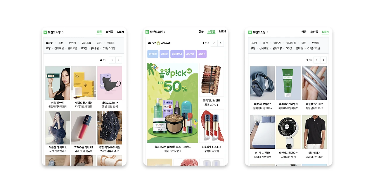 같은 쇼핑이라도 카테고리에 따라 달라지는 썸네일 : 같은 트랜드 쇼핑이라도 유저가 어떤 초점을 가졌는지에 따라 제공하는 정보가 다르다. ‘상품'에 초점을 맞춘다면 트랜드에 맞는 상품을 보여줌으로써 해당 시기와 상황에 따른 상품의 나열을 확인할 수 있다. 상품에 집중하기 위해서 썸네일과 상품을 잘 보여주거나 구매 욕구가 생기게 하는 타이틀, 설명을 제공한다. 반면, ‘쇼핑몰’에 초점을 맞춘다면 해당 쇼핑몰에서 어떤 상품을 집중적으로 할인해서 파는지, 어떤 이벤트를 하는지에 대한 홍보 이미지를 상품 썸네일보다 크게 만들어 집중시키는 레이아웃을 사용한다.