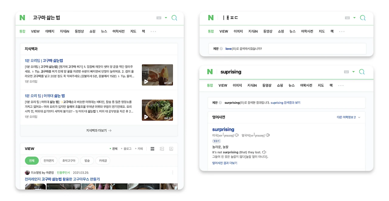 다양한 시점의 답을 보여주고, 실수를 찰떡같이 알아듣기 : 네이버는 현재 많은 서비스를 운영하고 있다. 블로그, 영상, 카페글 등 다양한 사람이 개인 기록을 남기거나, 집단 지성의 힘으로 질문을 남기고 답변을 남긴다. 질의응답이 끝나면 사라지는 게 아니라 다른 사람도 찾아볼 수 있는 기록이 된다. 이처럼 다양한 기록을 모두 모아서 검색 결과로 보여주는 검색 결과창은 검색창 아래 메뉴 페이지로 이동해 각 분야에 맞는 결과만 확인할 수 있지만, 단순히 마우스를 내려 원스크롤로 지식백과 - VIEW(네이버에서 운영하는 블로그, 카페 글을 모아서 보여주는 기능) - 블로그(외부 블로그도 함께 보여준다) - 동영상 - 지식 IN - 이미지 - 뉴스 - 파워링크 등으로 다양한 구성이 되어있다. 검색이 사전적인 정보를 얻는 검색일 수도 있고, 다른 사람의 상황이나 리뷰를 확인하기 위할 수도 있기 때문에 필요한 정보를 골라 볼 수 있다.
