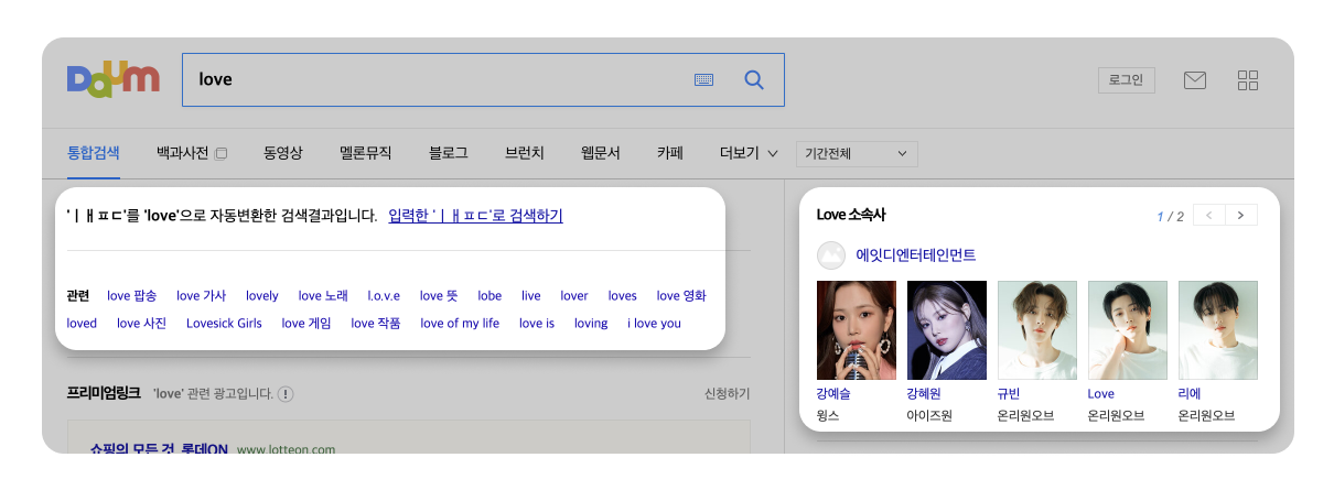자동변환과 검색 : 검색 포탈 서비스에서 볼 수 있는 기본 기능으로 오탈자, 미처 영문 전환을 하지 못했을 경우 자동으로 변환해주는 기능에서 자동변환된 단어에 대한 정보를 우측 패널에서 제공해주고 있다.