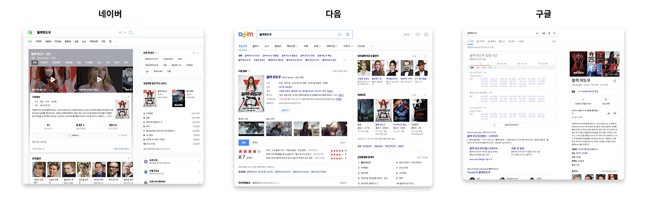 검색어에 집중하다 : 국내 포털 사이트는 해당 검색어의 기본적인 정보를 보여준다면 구글은 사용자의 환경 정보까지 응용해서 검색어에 대한 다양한 정보를 보여준다. 영화를 검색할 경우 국내 사이트에서는 영화의 기본정보를 우선 제공 후 ‘영화' 카테고리에 속한 다른 영화 정보를 보여주는 반면, 구글은 해당 검색 영화에 집중해 예매 시간과 함께 다양한 포털 사이트의 검색 결과를 보여준다.