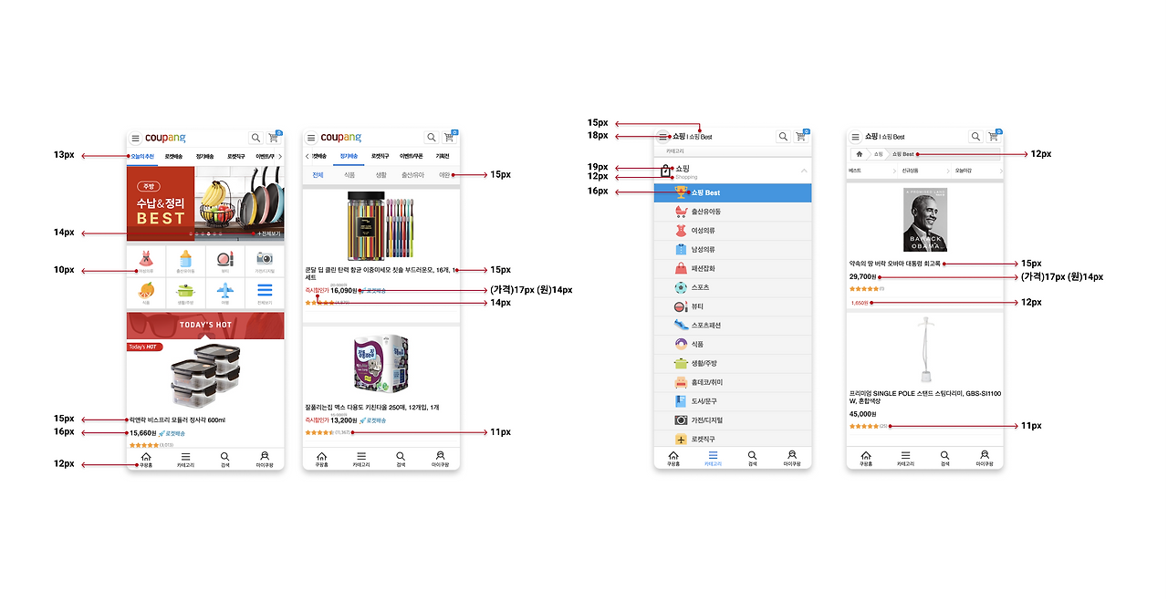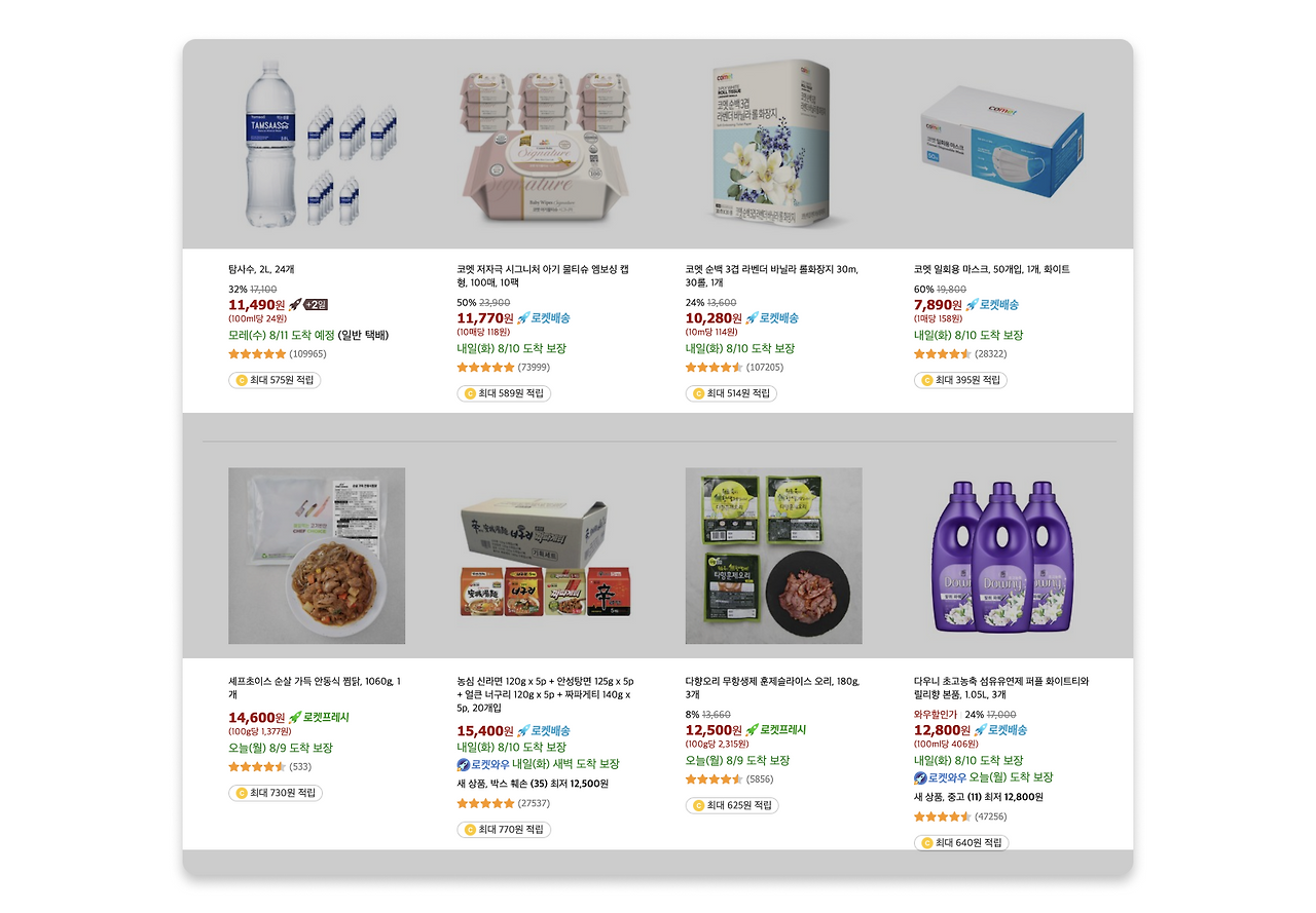 접속 디바이스에 따라 달라지는 디자인 : 앱에 집중하거나 pc화면, 하나를 골라 집중한 서비스가 많다. 하지만 쿠팡은 각 환경에 따라 다른 디자인을 가지고 있다. 굳이 핸드폰에서 앱을 깔지 않아도 상품을 크게 살펴볼 수 있는 모바일 웹과 큰 화면에 다양한 상품을 나열해 상품을 확인하고 비교하기 쉬운 PC 웹. 그리고 앱을 설치해서 빠르게 상품을 구매할 뿐만 아니라 쿠팡이츠 등 연계 서비스도 편하게 이용할 수 있도록 제공한다. 굳이 앱을 설치하지 않아도 ‘구매’에 어려움이 없다. 앱을 설치하면 좋지만 ‘앱’만 집중하지 않았다.