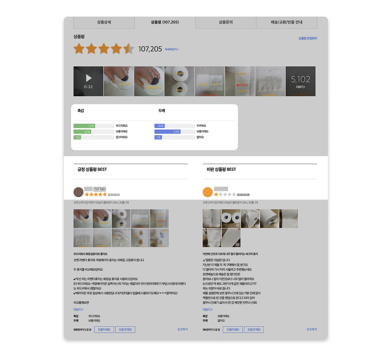 상품에 따라 달라지는 정보와 사용자가 직접 말해주는 장단점 : 휴지라면 구매자가 촉감과 두께를 판단해서 리뷰를 달고, 해당 정보의 통계를 보여준다. 판매자가 홍보를 위해 말하는 것과 다를 수 있기 때문에 실사용자의 후기를 보고 구매를 고민할 수 있을 뿐만 아니라, 해당 상품에 대해 실사용자가 느낀 장점(긍정)과 반대로 단점(비판)을 사실적으로 파악할 수 있다. 상품평을 통해 판매를 위해 좋은 말로만 표현하고, 소비자가 알고 싶지만 굳이 말해주지 않는 점도 적나라하게 알 수 있다. 가짜 리뷰와 별점으로 상품 관리를 하는 판매자를 구별할 수 있는 기능으로, 실물을 보고 사는 게 아닌 비대면 구매지만 실제로 본 것처럼 원하는 상품을 구매할 확률이 높아진다.